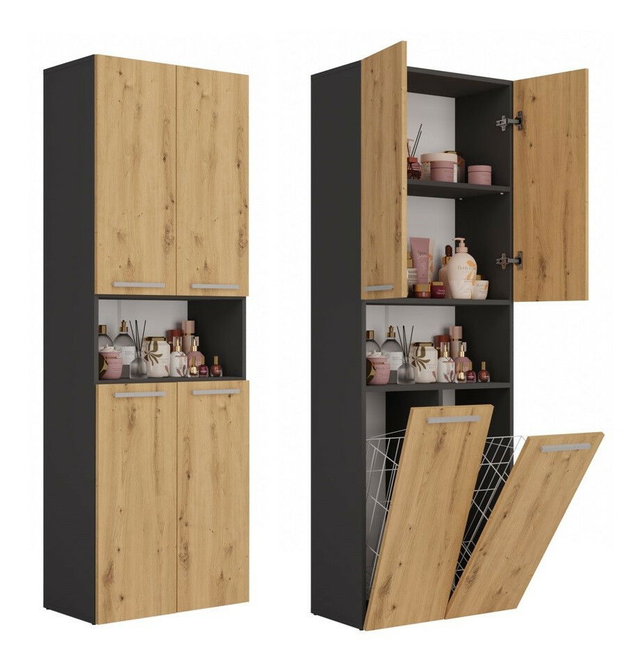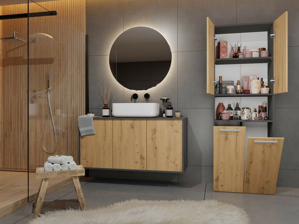 ZobrazitKoupelnová skříňka Neltossa 6 v elegantní kombinaci antracit a dub artisan je ideálním řešením pro každou moderní koupelnu. S praktickým designem a minimalistickými plastovými úchyty nabízí dostatek úložného prostoru v podobě tří polic a dvou košů, čímž efektivně pomáhá udržovat pořádek. Skříňka je vyrobena z kvalitní laminované dřevotřísky s ABS hranami, což zaručuje její vysokou odolnost vůči mechanickému a chemickému poškození. S rozměry 60 cm na šířku a 174 cm na výšku se skvěle hodí i do menších prostor.