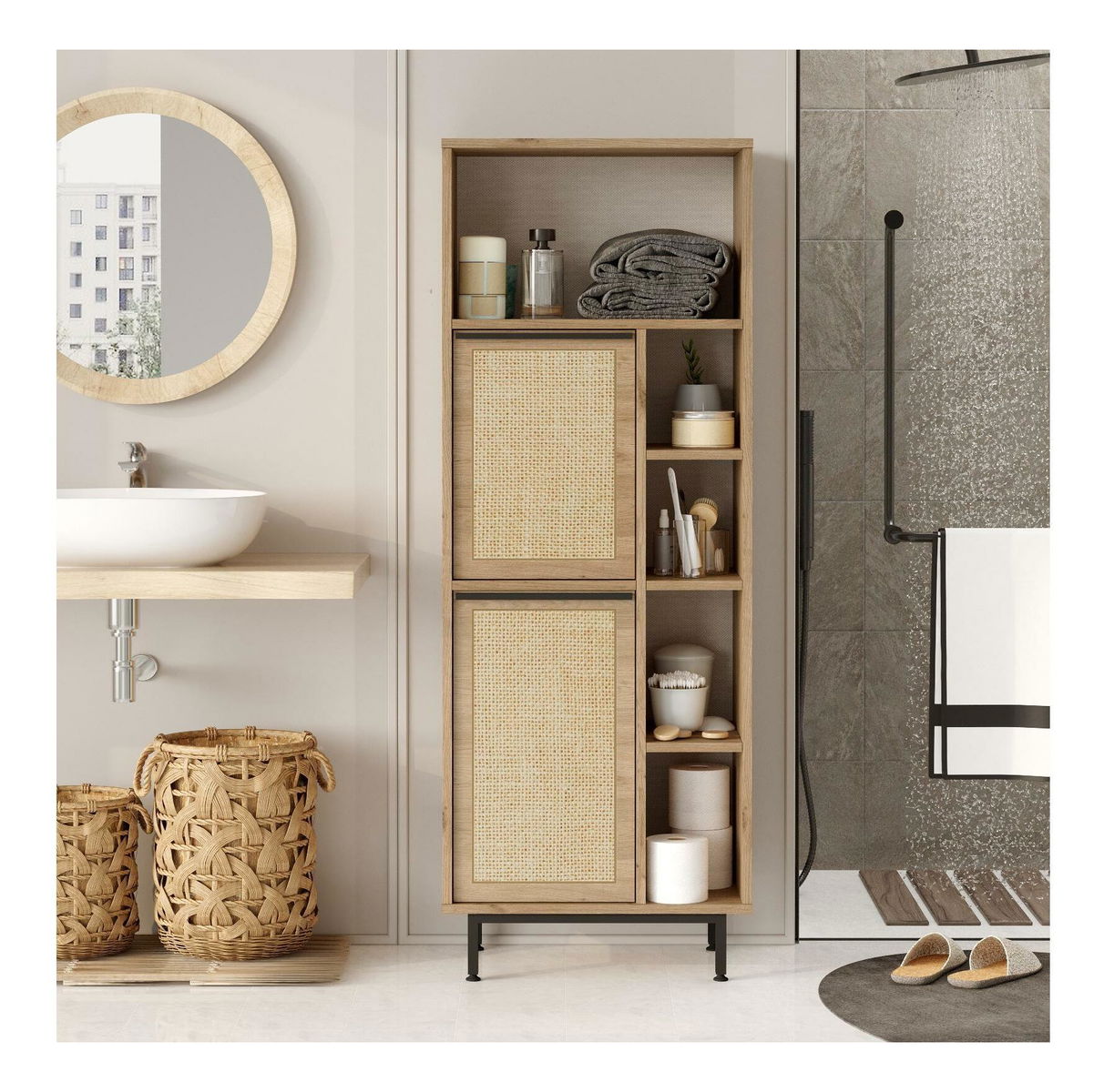 Na dvířkách se nachází pouze potisk s imitací struktury ratanu.