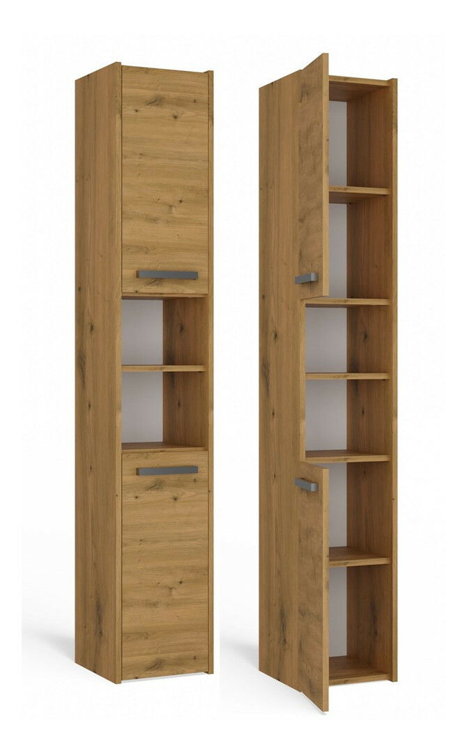 ZobrazitKoupelnová skříňka Samways 1 v elegantní barvě dub artisan je ideálním řešením pro každou moderní koupelnu, kde je zapotřebí efektivně uspořádat prostor. S rozměry 30 cm na šířku a hloubku a výškou 170 cm nabízí dostatek úložného prostoru bez zbytečného zabírání místa. Minimalistické plastové úchyty ve stříbrné barvě zajišťují pohodlný přístup k obsahu skříňky, přičemž možnost volby strany otevírání dveří přispívá k její praktičnosti. Skříňka je vyrobena z kvalitní laminované dřevotřísky, což zaručuje její dlouhou životnost a snadnou údržbu.