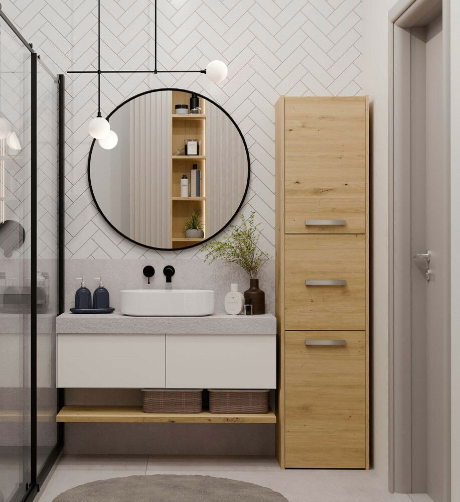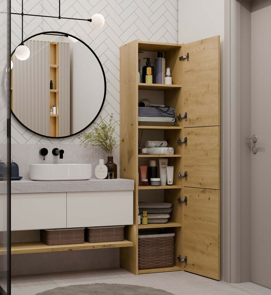 ZobrazitKoupelnová skříňka Samways 4 v elegantní barvě dub artisan je ideálním řešením pro každou moderní koupelnu. S rozměry 40 cm na šířku, 30 cm na hloubku a 170 cm na výšku nabízí dostatek úložného prostoru bez zbytečného zabírání místa. Minimalistické plastové úchyty ve stříbrné barvě zajišťují pohodlný přístup k obsahu skříňky, zatímco kvalitní laminované dřevo zaručuje dlouhou životnost. Skříňka je navržena s možností volby strany otevírání dveří, což zvyšuje její praktičnost a přizpůsobivost.