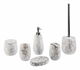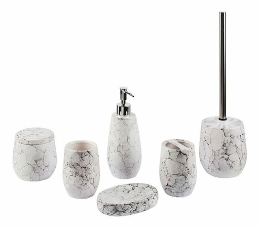 Udělejte si v koupelně pořádek pomocí této 6-dílné sady příslušenství. Sada obsahuje vše, co budete potřebovat k tomu, aby byla vaše kosmetika a doplňky přehledně uloženy – dávkovač s pumpičkou, širokou misku na mýdlo či držák na zubní kartáčky se dvěma otvory. Kromě toho jsou k dispozici také dvě nádoby, přičemž jedna z nich je vybavena víkem, takže v ní můžete skladovat různé drobnosti, a WC kartáč s držákem. Všechny kusy jsou vyrobeny z dolomitu s elegantní povrchovou úpravou připomínající mramor, která vaší koupelně dodá nový vzhled.