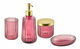 Dodejte vaší koupelně trochu barev s touto jedinečnou 4dílnou sadou. Obsahuje vše, co potřebujete k uspořádání kosmetiky a doplňků. Půvabnou růžovou barvu krásně doplňuje zlatá povrchová úprava pumpičky dávkovače a víka dózy. Všechny prvky jsou vyrobeny ze skla, takže nerezaví a dají se snadno otřít.