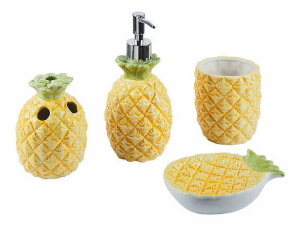 Vneste do své koupelny veselou atmosféru pomocí této jedinečné sady koupelnových doplňků. Při pohledu na rozkošný motiv ananasu budete mít vždy dobrou náladu a úsměv na tváři. Dávkovač a miska na mýdlo, držák na zubní kartáčky a praktická nádobka vám pomohou zorganizovat všechny potřebné věci, aniž byste museli dělat kompromisy týkající se stylu.