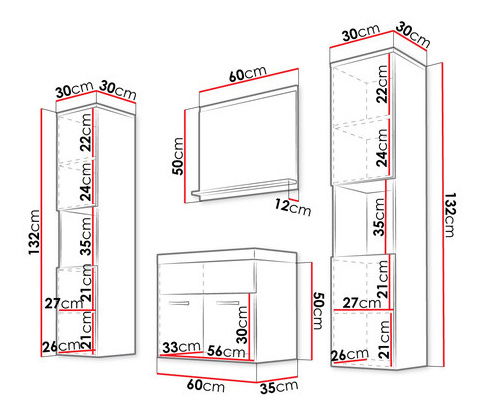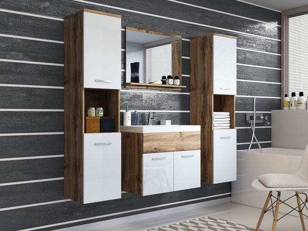 ZobrazitKoupelnový nábytek je ideální volbou pro ty, kdo hledají pohodlí a styl. V koupelně nikdy není dost prostorného úložného prostoru, proto je koupelnový nábytek Floryna XL vybaven řadou prostorných skříněk a polic na kosmetiku. Souprava sestává ze závěsných sloupků, zrcadla s poličkou a skříňky pod umyvadlem a nabízí také dostatek prostoru na ručníky, čistící prostředky a dekorativní předměty. Barevnost sady koupelnového nábytku Floryna si můžete vybrat z široké nabídky nejmodernějších barev. Barevná paleta obsahuje vhodné návrhy pro světlé i malé nebo tmavé koupelny. Rozměry prvků koupelnové sestavy: Závěsná skříňka (x2): šířka: 30 cm, výška: 132 cm, hloubka: 30 cm, Zrcadlo s poličkou: šířka: 60 cm, výška: 50 cm, hloubka: 12 cm, Skříňka pod umyvadlo: šířka: 60 cm, výška: Umyvadlo: šířka: 60 cm, výška: 5 cm, hloubka: 35 cm Provedení: korpus: 15 mm silná matná laminovaná deska, fronta: laminovaná deska silná 15 mm (mat) a deska POLYGLOSS silná 15 mm (lesk), ABS dýha (horní okraj + přední díl kovová držadla, sifon - za příplatek, obdélníkové dolomitové umyvadlo Umyvadlovou baterii lze dokoupit jako dodatečnou možnost - více informací níže: Umyvadlová baterie Economico BYU 020M Umyvadlová baterie Platino BCZ 020M Záruka: 24 měsíců