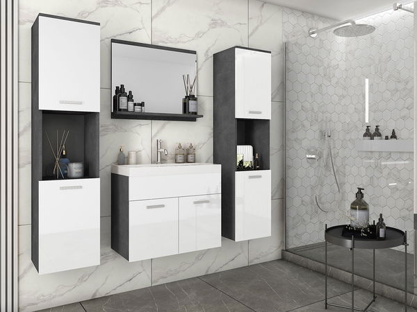 ZobrazitKoupelnový nábytek je ideální volbou pro ty, kdo hledají pohodlí a styl. V koupelně nikdy není dost prostorného úložného prostoru, proto je koupelnový nábytek Floryna XL vybaven řadou prostorných skříněk a polic na kosmetiku. Souprava sestává ze závěsných sloupků, zrcadla s poličkou a skříňky pod umyvadlem a nabízí také dostatek prostoru na ručníky, čistící prostředky a dekorativní předměty. Barevnost sady koupelnového nábytku Floryna si můžete vybrat z široké nabídky nejmodernějších barev. Barevná paleta obsahuje vhodné návrhy pro světlé i malé nebo tmavé koupelny. Rozměry prvků koupelnové sestavy: Závěsná skříňka (x2): šířka: 30 cm, výška: 132 cm, hloubka: 30 cm, Zrcadlo s poličkou: šířka: 60 cm, výška: 50 cm, hloubka: 12 cm, Skříňka pod umyvadlo: šířka: 60 cm, výška: Umyvadlo: šířka: 60 cm, výška: 5 cm, hloubka: 35 cm Provedení: korpus: 15 mm silná matná laminovaná deska, fronta: laminovaná deska silná 15 mm (mat) a deska POLYGLOSS silná 15 mm (lesk), ABS dýha (horní okraj + přední díl kovová držadla, sifon - za příplatek, obdélníkové dolomitové umyvadlo Umyvadlovou baterii lze dokoupit jako dodatečnou možnost - více informací níže: Umyvadlová baterie Economico BYU 020M Umyvadlová baterie Platino BCZ 020M Záruka: 24 měsíců