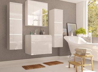 - Vysoká koupelnová skříňka – hlavní úložný prostor. Její šířka může být od 30 po 60 centimetrů a napomáhá i uložení do výšky, které šetří místo.