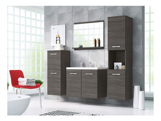 Koupelnový nábytek musí odolat vysoké vlhkosti. Nejlevnější nábytek pořídíte z laminované dřevotřísky s čelními plochami ošetřenými lesklým lakem. Více si připlatíte za koupelnové sestavy z MDF desek nebo laminované dřevotřísky. Nejdražší je dřevěný nábytek. Ten je sice náročnější na údržbu, neboť vyžaduje péči voděodolnými laky nebo voskem.Zostavy picture 1