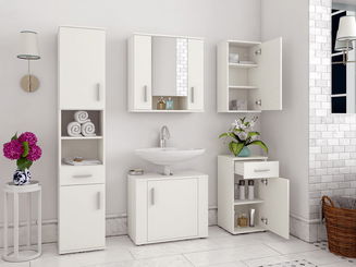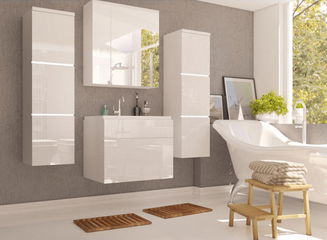 • Vysoká koupelnová skříňka – hlavní úložný prostor. Její šířka může být od 30 po 60 centimetrů a napomáhá i uložení do výšky, které šetří místo.