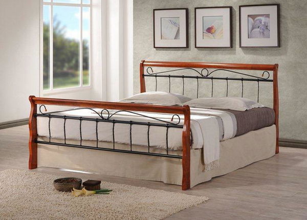Kovová manželská postel široká 160 cm v kombinaci se dřevem v barvě třešeň antická. Elegantní kovová postel je dodávána spolu s kvalitním lamelovým roštem. Výška čela u nohou je 70 cm a výška čela u hlavy je 105 cm (od podlahy).