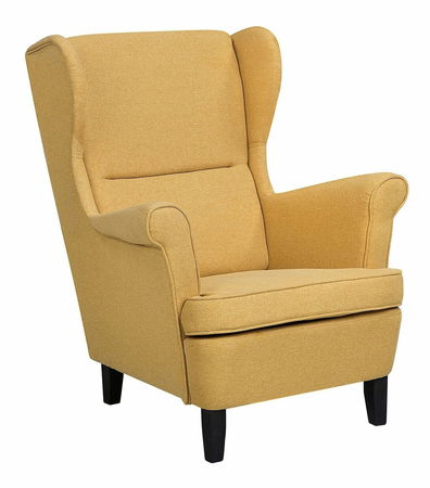 Čalouněné křeslo v sytém odstínu žluté, které nikdy nevyjde z módy, dokonale doplní jakýkoli interiér. Klasický tvar, známý také pod názvem ušák, s hrubě vyztuženým sedátkem, vysokým opěradlem a klasickými zaoblenými bočními rameny se hodí do ložnice i obývacího pokoje zařízeného v moderním nebo vintage stylu. Umístěte do rohu nebo vedle konferenčního stolku a vytvořte si pohodlné a útulné místo k relaxaci.
