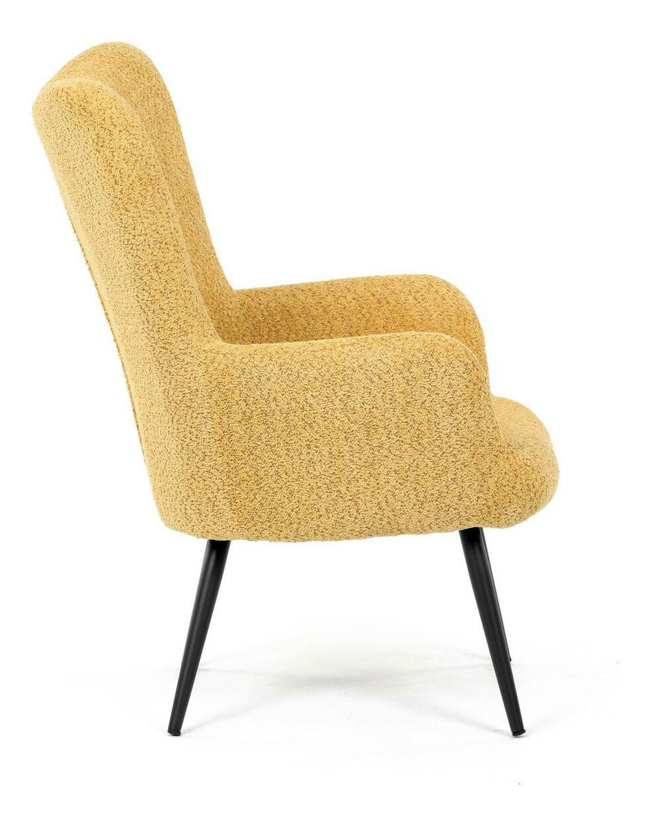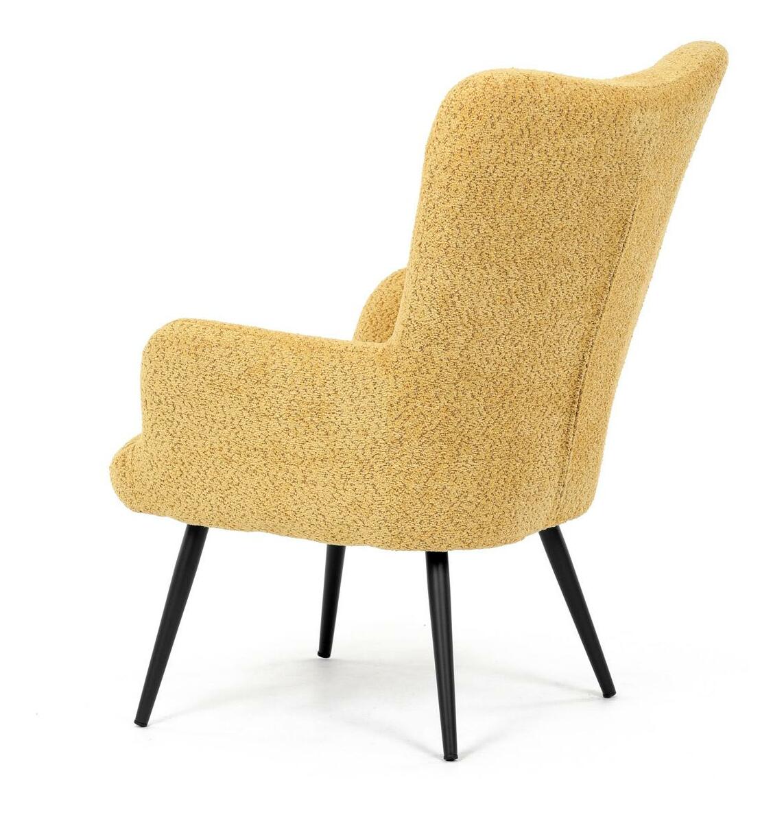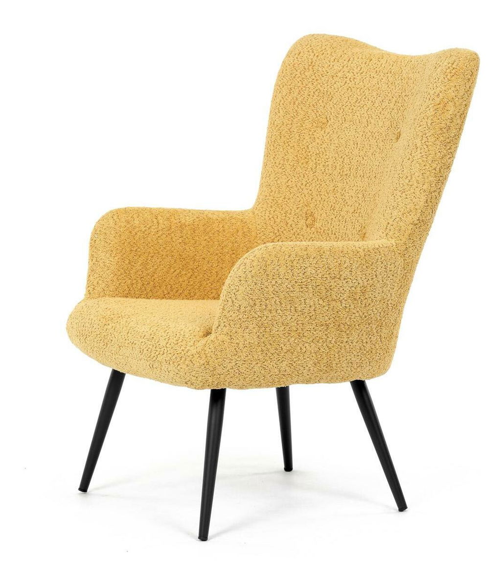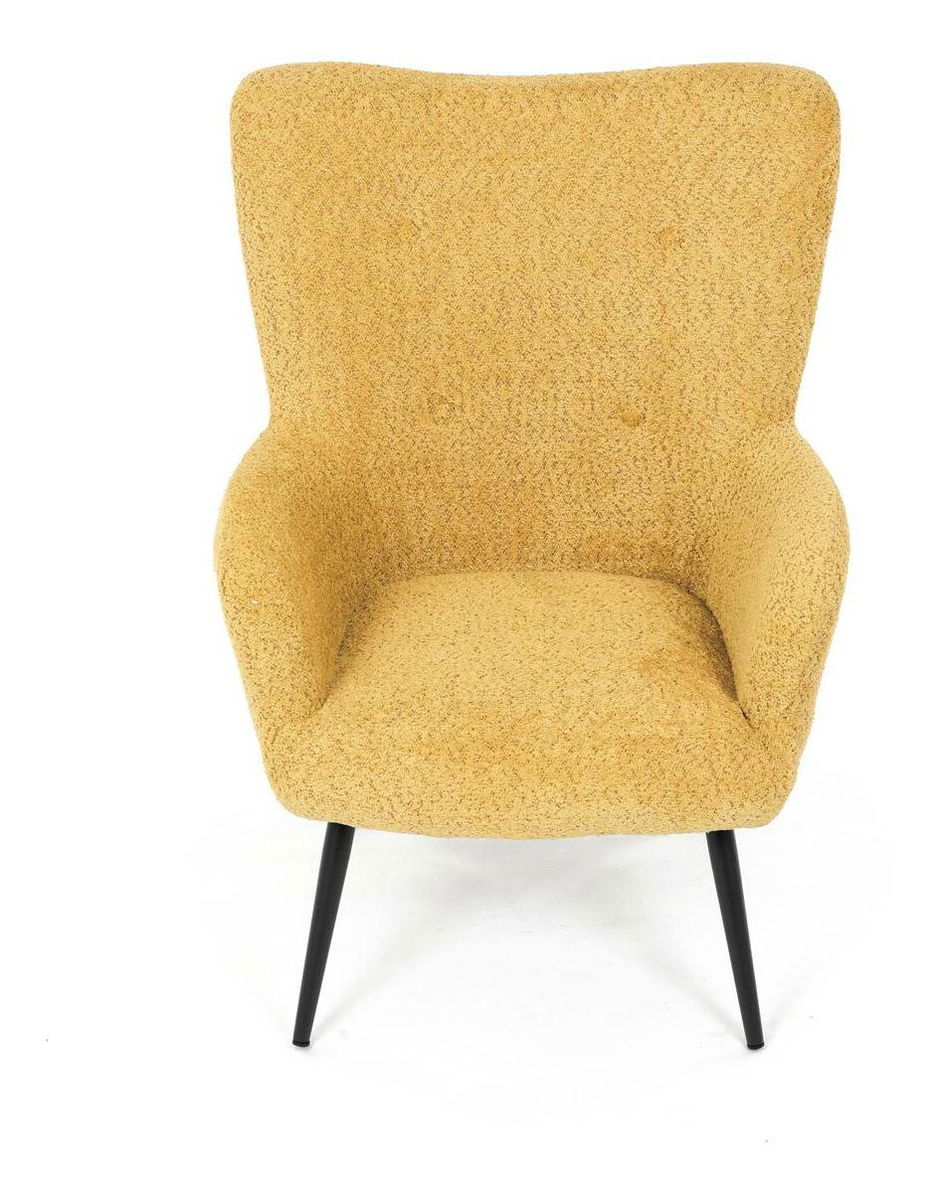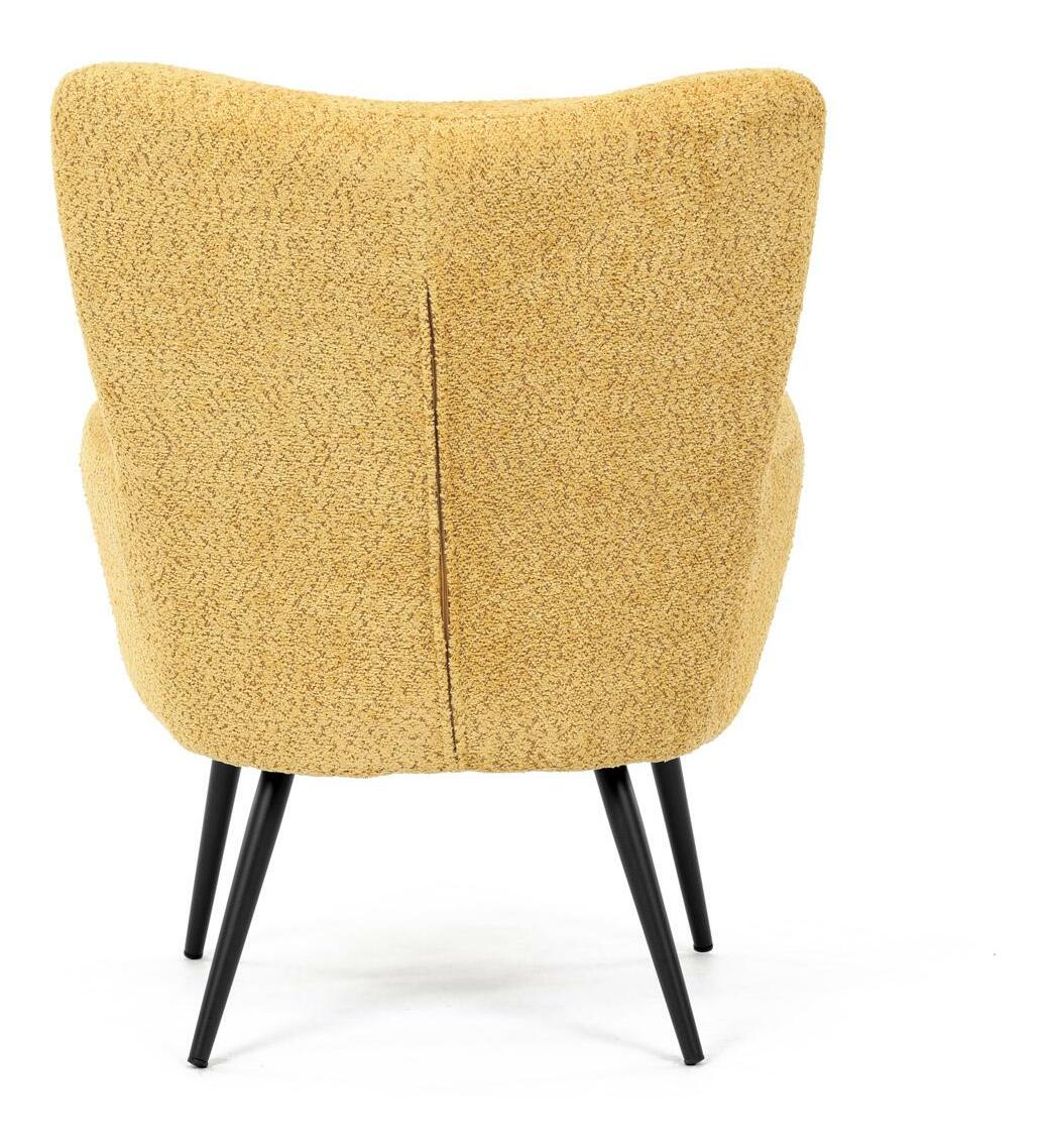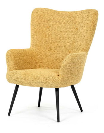 Elegantní křeslo ušák vnese do vašeho obývacího pokoje pohodlí a styl. Žluté čalounění z látky Bouclé působí jemně a moderně, zatímco ergonomicky tvarované područky a opěradlo s jemnými knoflíky zajišťují maximální komfort. Stabilní kovové nohy s černým povrchem dodávají křeslu industriální nádech a zajišťují pevnost i při každodenním používání. Toto křeslo je ideální pro chvíle relaxace s knihou nebo při posezení s přáteli. Díky svému jednoduchému designu snadno zapadne do každého interiéru.