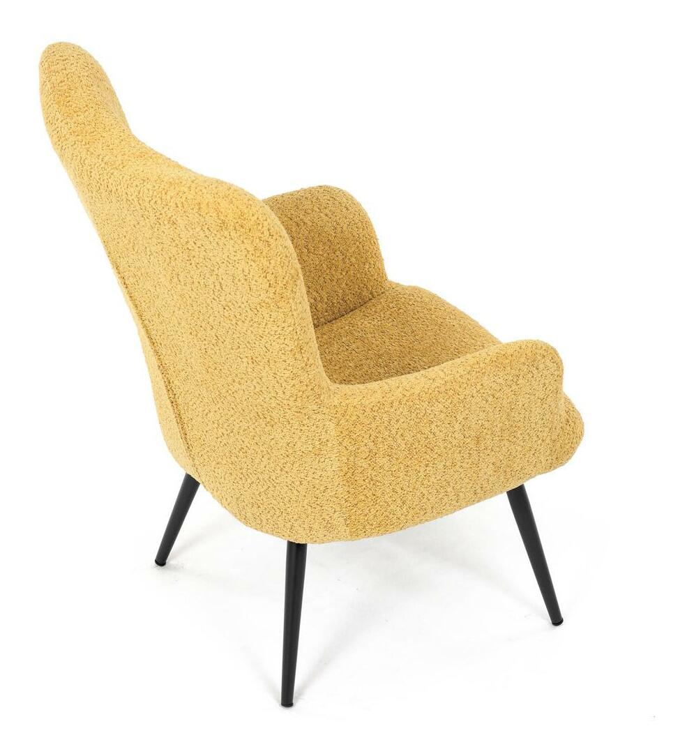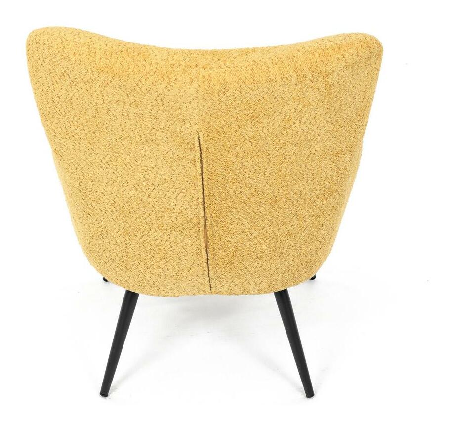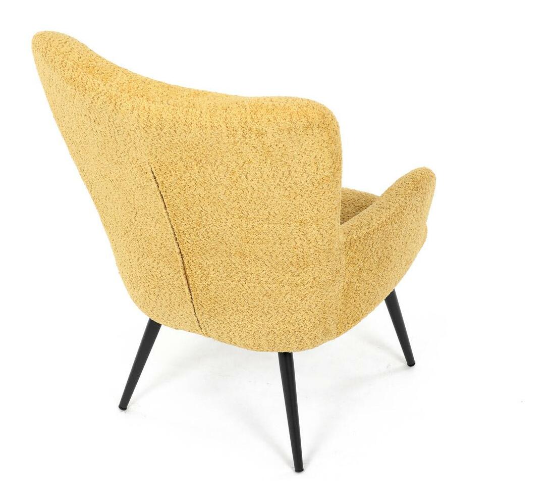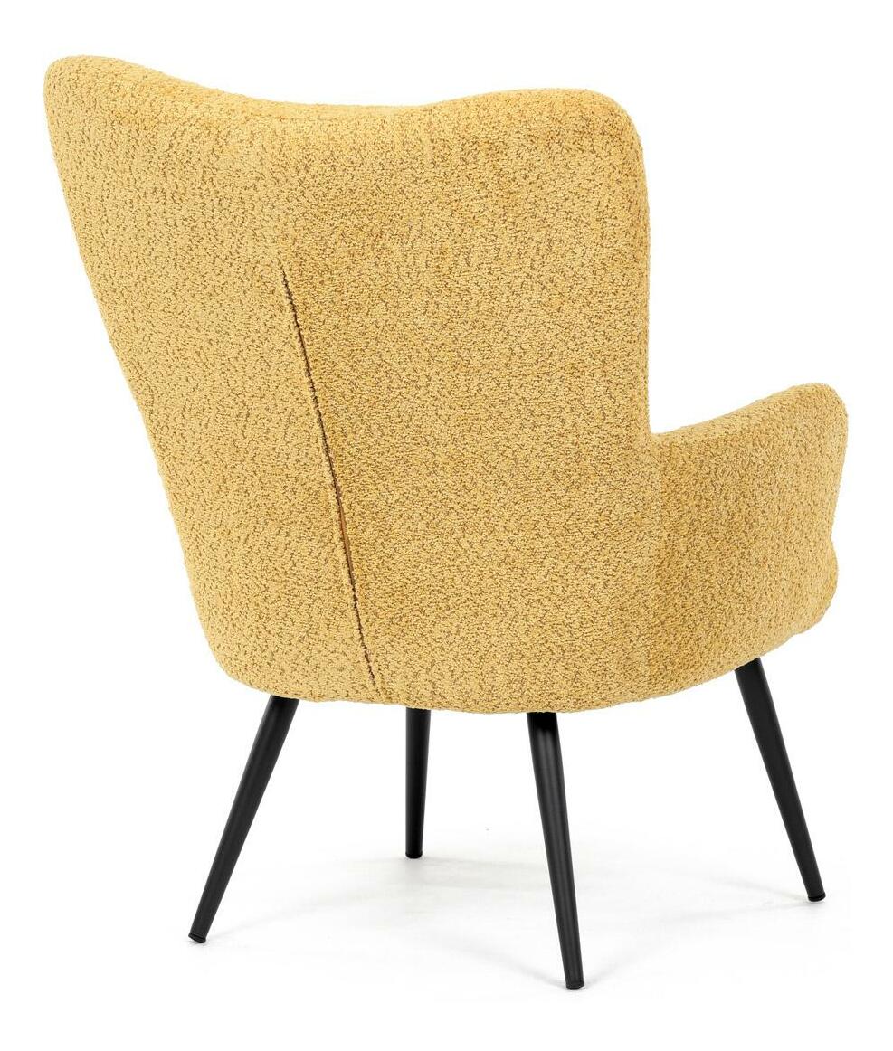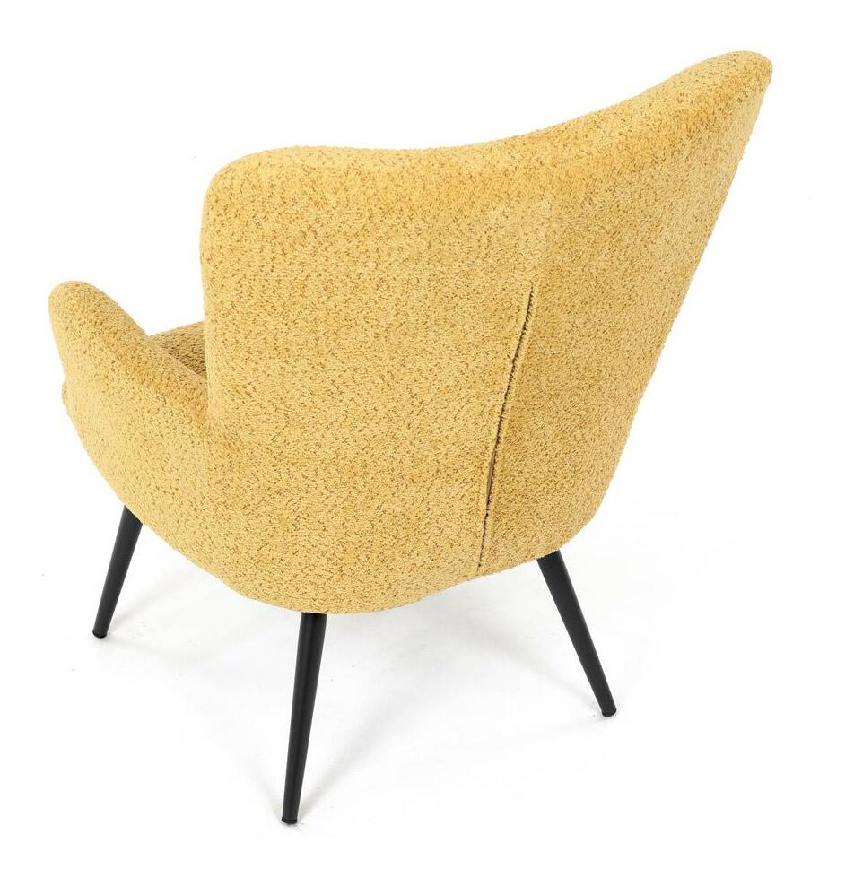 Elegantní křeslo ušák vnese do vašeho obývacího pokoje pohodlí a styl. Žluté čalounění z látky Bouclé působí jemně a moderně, zatímco ergonomicky tvarované područky a opěradlo s jemnými knoflíky zajišťují maximální komfort. Stabilní kovové nohy s černým povrchem dodávají křeslu industriální nádech a zajišťují pevnost i při každodenním používání. Toto křeslo je ideální pro chvíle relaxace s knihou nebo při posezení s přáteli. Díky svému jednoduchému designu snadno zapadne do každého interiéru.