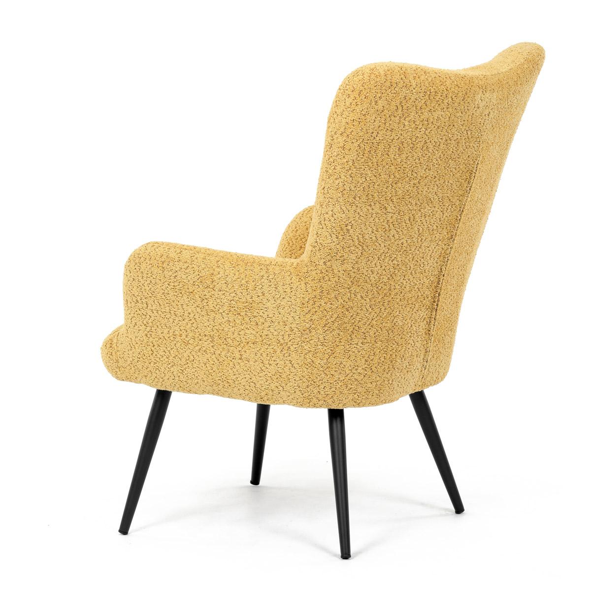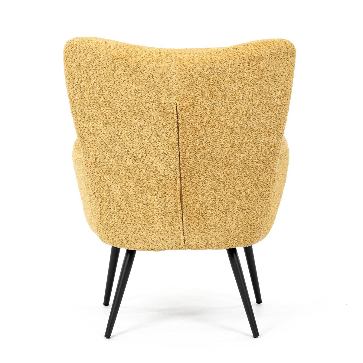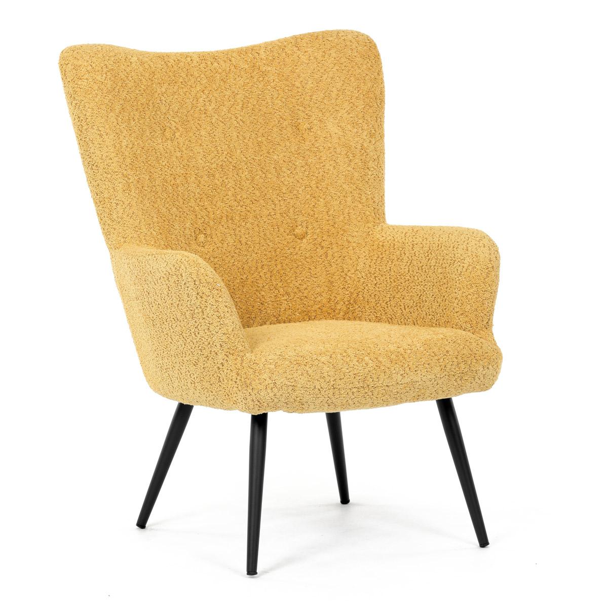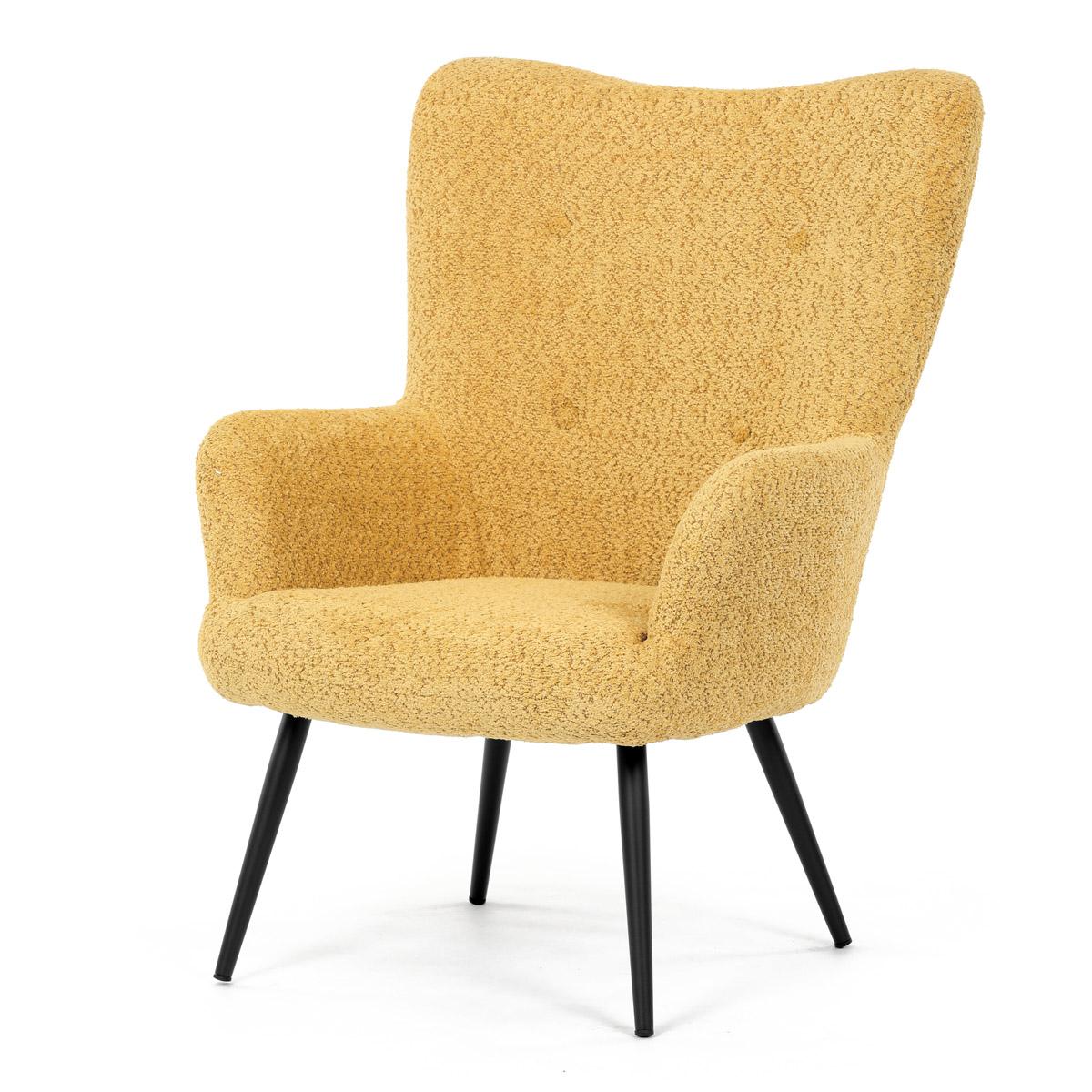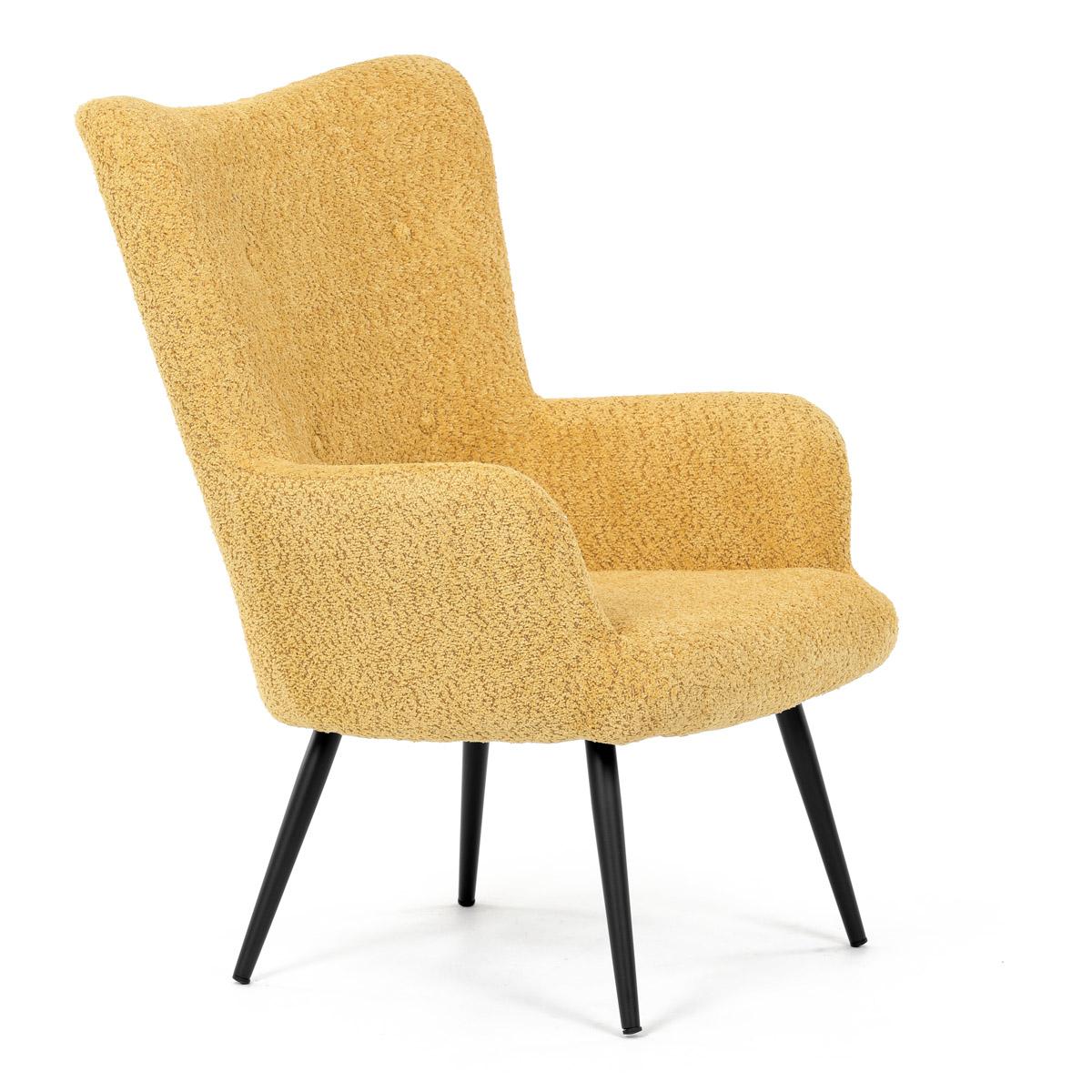 ZobrazitElegantní křeslo ušák vnese do vašeho obývacího pokoje pohodlí a styl. Žluté čalounění z látky Bouclé působí jemně a moderně, zatímco ergonomicky tvarované područky a opěradlo s jemnými knoflíky zajišťují maximální komfort. Stabilní kovové nohy s černým povrchem dodávají křeslu industriální nádech a zajišťují pevnost i při každodenním používání. Toto křeslo je ideální pro chvíle relaxace s knihou nebo při posezení s přáteli. Díky svému jednoduchému designu snadno zapadne do každého interiéru.