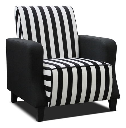 Stylové křeslo, které zpestří vaše interiéry svým výrazným pruhovým vzorem. Sedací část křesla je vyplněna vlnitými pružinami. Křeslo má dřevěné nohy.
