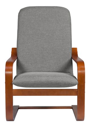 Designově velmi zajímavé křeslo s čalouněným sedákem a opěradlem a dřevěnými opěrkami rukou. Dřevěné opěrky rukou přímo procházejí dolů a vytvářejí tak nohy křesla.