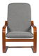 Designově velmi zajímavé křeslo s čalouněným sedákem a opěradlem a dřevěnými opěrkami rukou. Dřevěné opěrky rukou přímo procházejí dolů a vytvářejí tak nohy křesla.