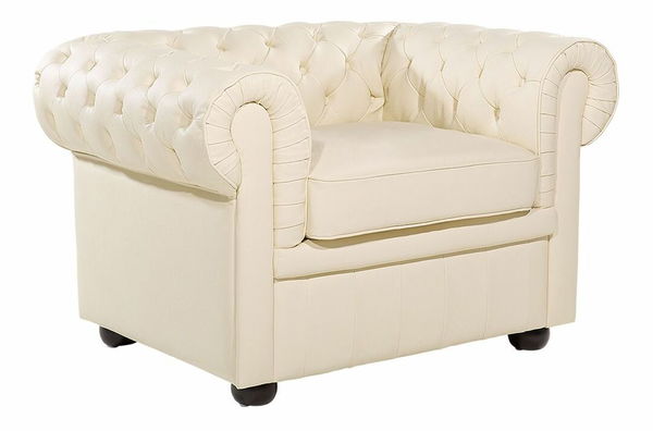 Nádherné béžové křeslo v klasickém stylu Chesterfield je výsledkem precizního zpracování. Hrubá pěnová výplň zaručuje pohodlné sezení a pevná konstrukce křesla je zárukou dlouholeté odolnosti. Opěradlo, sedací část a boční opěrky jsou čalouněny pravou kůží, zatímco spodní a zadní část křesla spolu s bočními stranami pokrývá kvalitní umělá kůže. Díky nadčasovému designu, prošívanému opěradlu a elegantním bočním opěrkám se toto křeslo stane krásným středobodem obývacího pokoje nebo kanceláře.