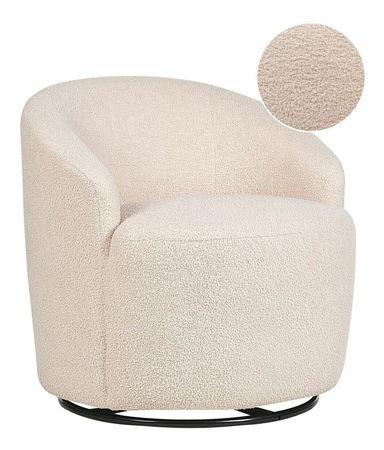 S tímto stylovým křeslem osvěžíte vzhled svého obývacího prostoru a získáte tak pohodlné místo k odpočinku. Křeslo je vyrobeno z kvalitních materiálů a díky béžovému buklému čalounění je velmi měkké a příjemné na dotek. Navíc jej lze bez námahy otáčet, protože je umístěno na černém otočném podstavci. Mírně zaoblené opěradlo a opěrky rukou zvýrazňují celkový retro design, díky čemuž přitáhne pozornost všech vašich hostů.