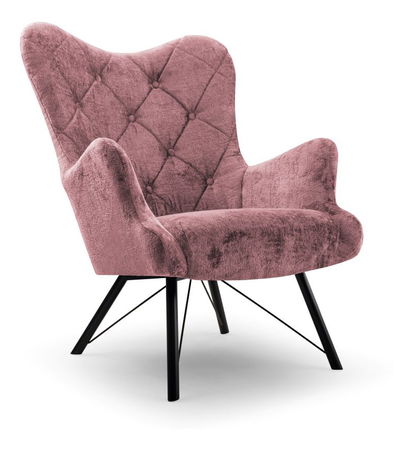 Retro křeslo typu "ušák" Křeslo - Muriella (růžová) o výšce 101 cm, šířce 80 cm a hloubce 88 cm je dokonalým spojením klasického stylu a moderního komfortu. Jeho rám je vyroben z kombinace masivního dřeva a dřevotřísky, což zaručuje pevnost a dlouhodobou odolnost. Sedadlo a opěradlo jsou vybaveny bonellovou pružinou o tloušťce drátu 2,4 mm a 3 cm silné pěny T 30, které poskytují vysoký komfort při sezení. Spodní konstrukce, včetně nožiček, je vyrobena z kovu a malována na černo, což dodává křeslu stylový a moderní vzhled. Zadní strana křesla je potažena stejnou látkou jako přední, což umožňuje jeho umístění kdekoli v místnosti bez ztráty estetického vzhledu. Křeslo je potaženo měkkou a luxusní velurovou tkaninou, což zvyšuje jeho estetickou hodnotu a poskytuje pohodlné sezení. Typ „ušák“ se vyznačuje charakteristickými bočními opěrkami, které zvyšují pocit pohodlí a soukromí, což činí toto křeslo ideálním místem k relaxaci a odpočinku.