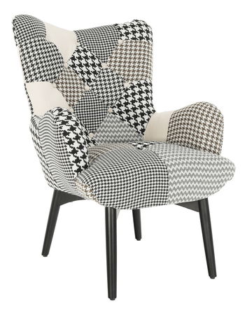 Patchwork, Jde o sešívání malých, různobarevných kousků látek tak, že spolu vytvářejí větší geometrické vzory. Tato technika povýšila křeslo na hotové umělecké dílo, které zaujme hned po vstupu do místnosti. Látka je doplněna dekorativními knoflíky, které mu dodávají osobitý styl. Křeslo působí něžným dojmem, může se pochlubit lákavými oblými tvary. Křeslo bylo navrženo tak, aby poskytovalo maximální pohodlí. Stabilitu mu zajišťují pevné nohy z masivního dřeva v černé barvě. Pokud jste typ člověka, který dává přednost trendovým a výrazným kouskem, křeslo PEPITO NEW TYP 4 je pro vás ta pravá volba.