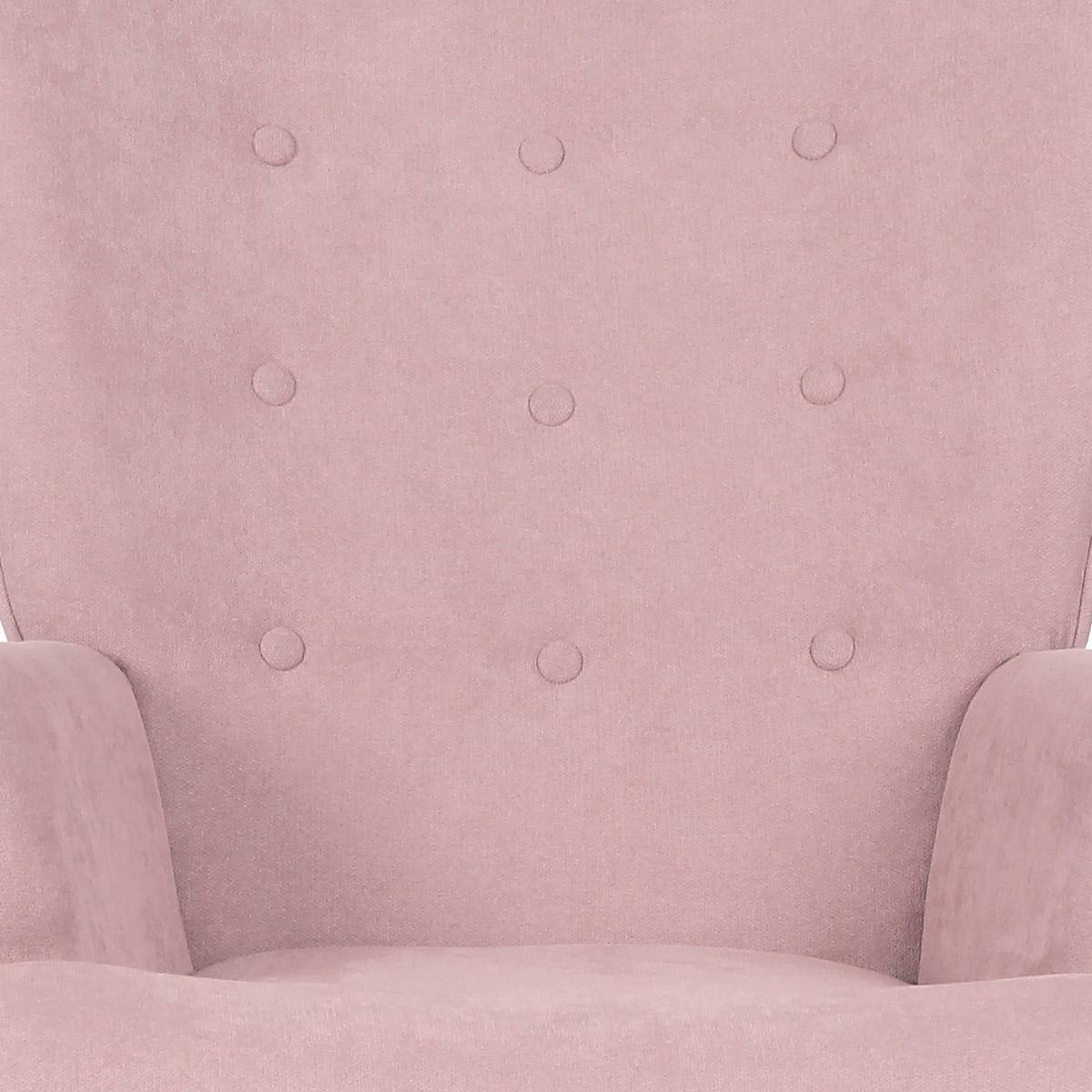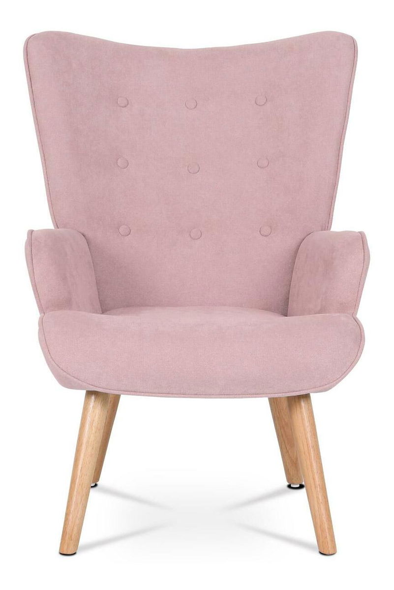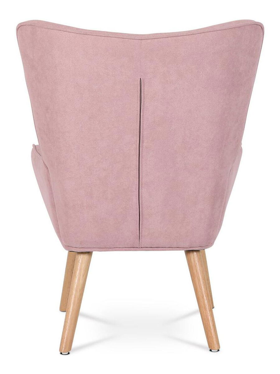 Křeslo minimalistických linií ve skandinávském stylu. Vyniká vysokým prohnutým opěradlem, úzkými a krátkými područkami a dekorativními jemnými čalounickými vtahy zakončenými knoflíky na čelní straně opěradla. To vše vytváří charakteristické severské retro linie tohoto křesla. Nejen design, ale hlavně pohodlí, které Vás obklopí při usednutí, bude příjemné zpestření při chvílích odpočinku a relaxace. A pro jeho zvýšení výborně poslouží i čtyřnohá a polstrovaná podnožka pro vyložení nohou, kterou ale můžete použít i jako příležitostný taburet. Potah je z výrazné starorůžové látky, kostra z masivního dřeva a výplň z kvalitní PU pěny. V místě sedáku jsou pro zkvalitnění sezení elastické popruhy. Dlouhé kónické dřevěné nohy jsou z masivního kaučukovníku v přírodním odstínu a lakovány transparentním lakem. Aby bylo eliminováno poškození podlahové krytiny, jsou opatřeny plastovými kluzáky. U zadních nohou rektifikovatelnými. Nosnost křesla je 120 kg.