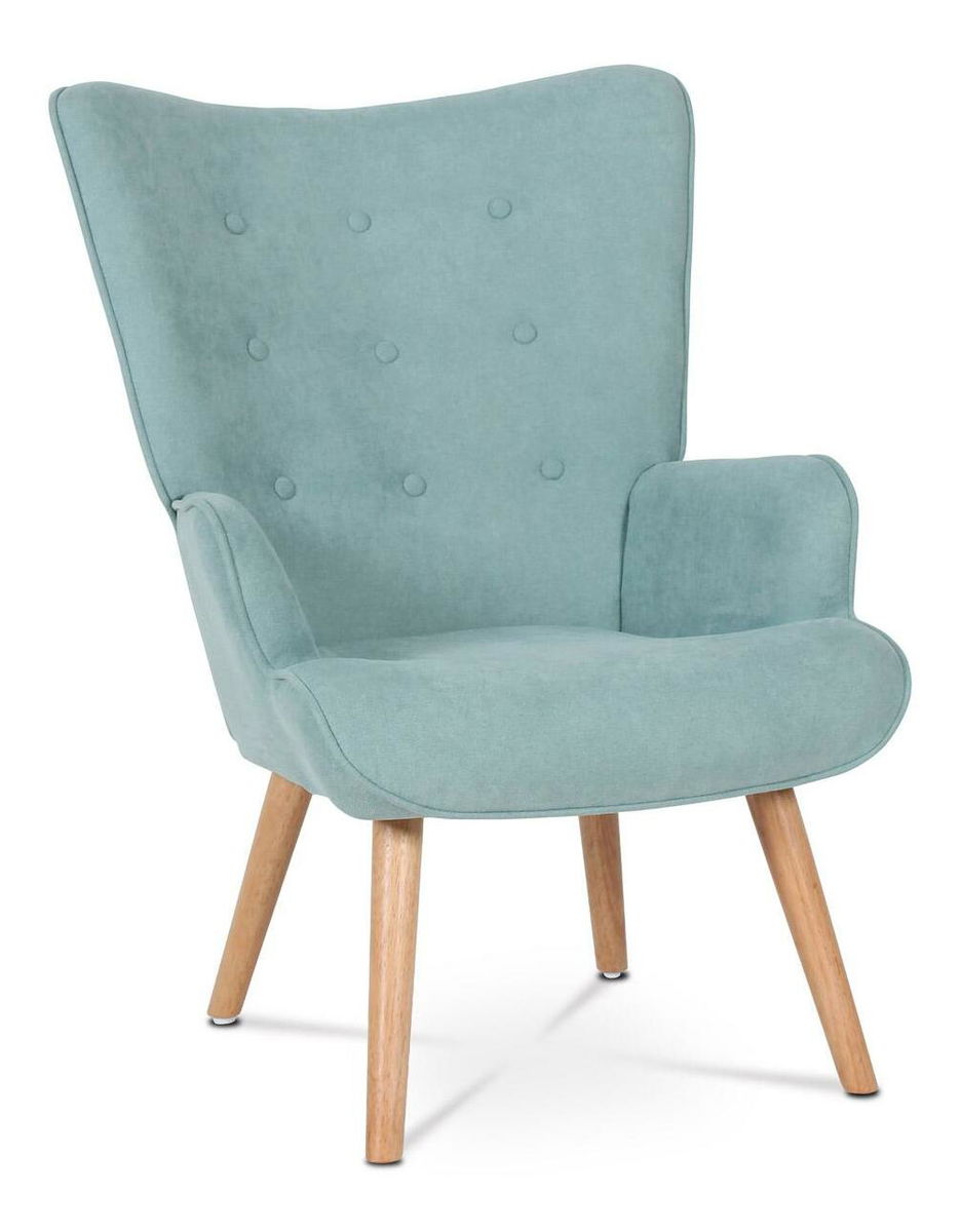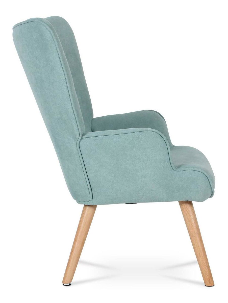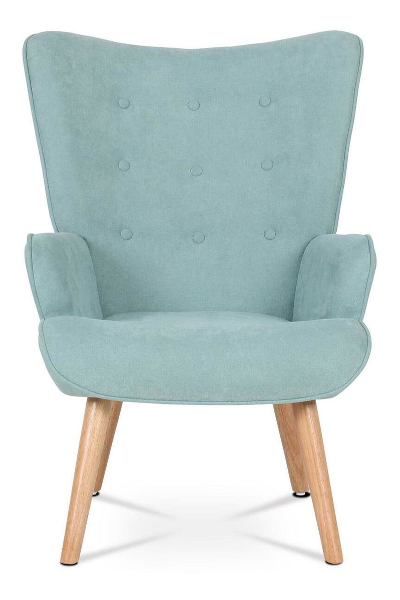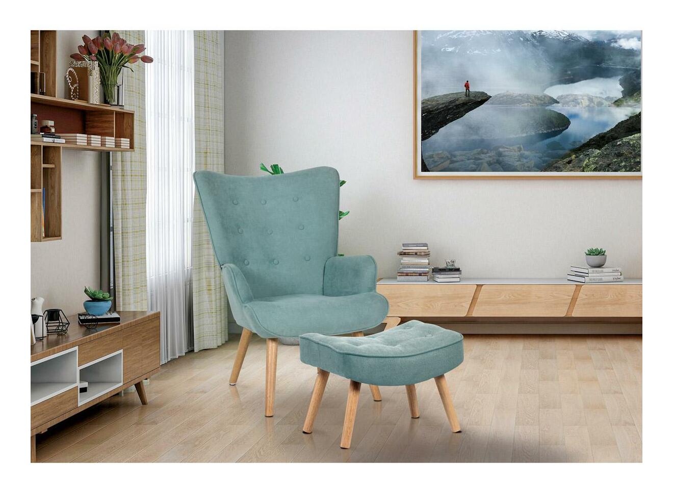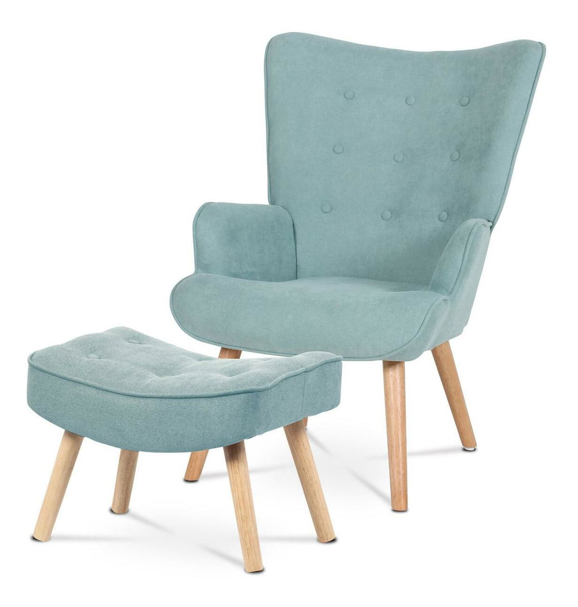 Křeslo minimalistických linií ve skandinávském stylu. Vyniká vysokým prohnutým opěradlem, úzkými a krátkými područkami a dekorativními jemnými čalounickými vtahy zakončenými knoflíky na čelní straně opěradla. zpestření při chvílích odpočinku a relaxace. A pro jeho zvýšení výborně poslouží i čtyřnohá a polstrovaná podnožka pro vyložení nohou, kterou ale můžete použít i jako příležitostný taburet. kónické dřevěné nohy jsou z masivního kaučukovníku v přírodním odstínu a lakovány transparentním lakem. Aby bylo eliminováno poškození podlahové krytiny, jsou opatřeny plastovými kluzáky.