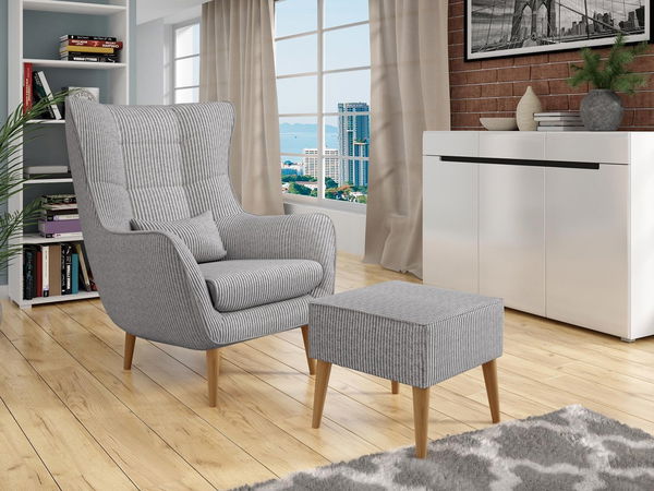 ZobrazitKřeslo Flerance s podnožkou poskytne neskutečný komfort a styl. Ergonomický tvar, područky a velké, měkké sedátko. Skandinávské křeslo poskytne maximální komfort relaxace. Můžete si v něm sednout a číst novou knihu as přidáním opěrky na nohy si po náročném dni vytáhnete nohy. Při koupi nábytku dostanete také malý polštářek, se kterým se vám bude relaxovat ještě lépe. Korpus křesla je vyvýšen na dřevěných nožičkách, které jsou charakteristické pro skandinávský styl. Křeslo s podnožkou je čalouněno příjemnou pruhovanou látkou, která dominuje světu interiérového designu. Model Flerance dodává místnosti teplo, pohodlí a útulnost.