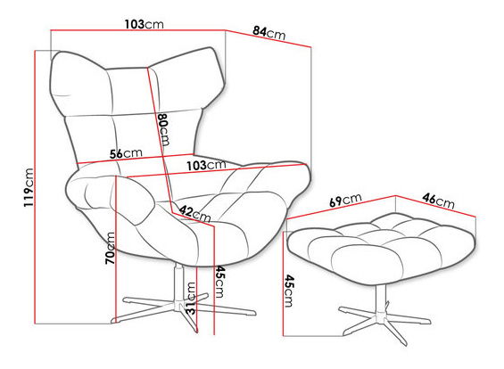 Křeslo Heimif s taburetkou je ideální volbou pro ty, kteří hledají pohodlí a styl. houpací funkci, která vám umožní odpočinout si po náročném dni a ukolébá vás ke krátkému odpolednímu spánku. 103 cm, šířka: 84 cm, výška: 119 cm Rozměry taburetky: délka: 69 cm, šířka: 46 cm, výška: 45 cm Provedení: rám: sklolaminátová forma, kovová základna, sedátko: N30 polyuretanová pěna, opěradlo: T21 polyuretanová pěna, geometrické zatížení židle: do 120 kg Záruka: 24 měsíců