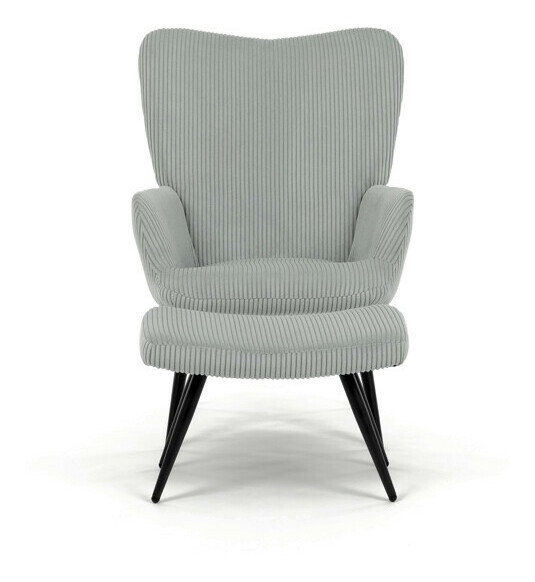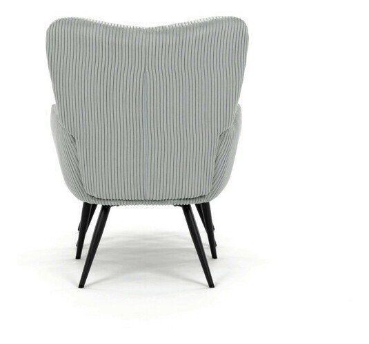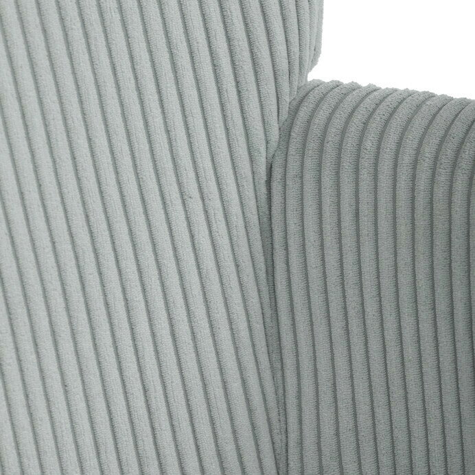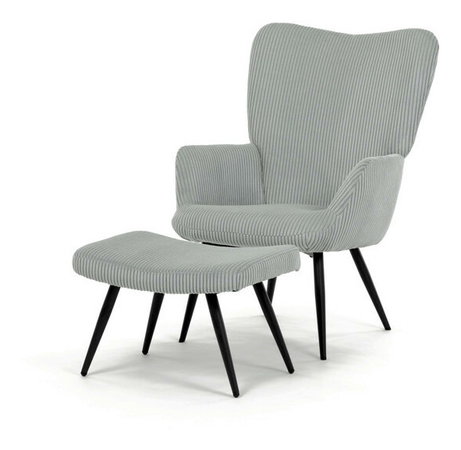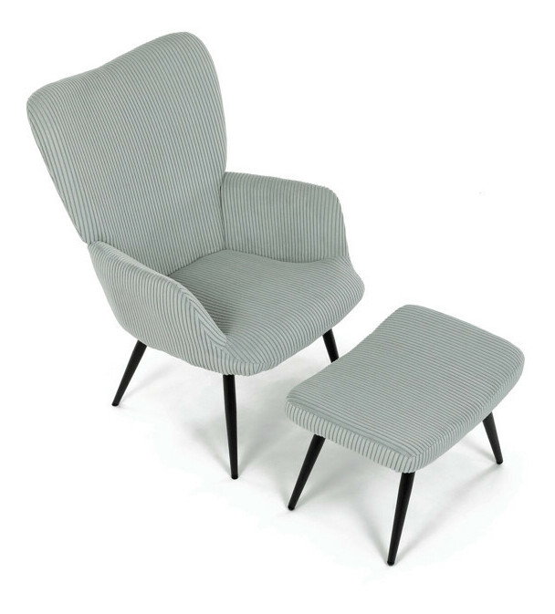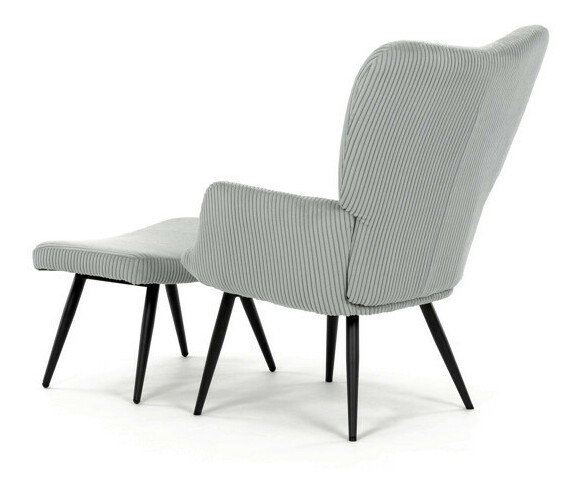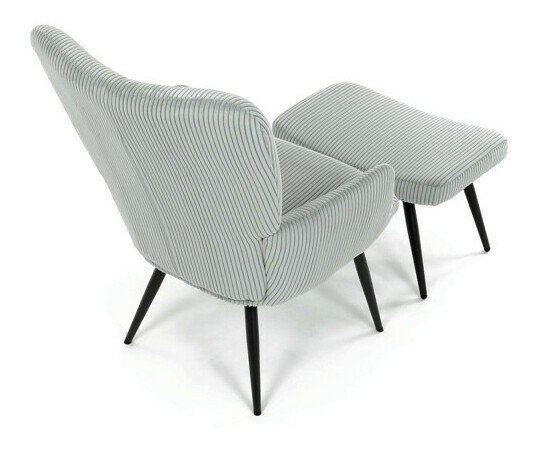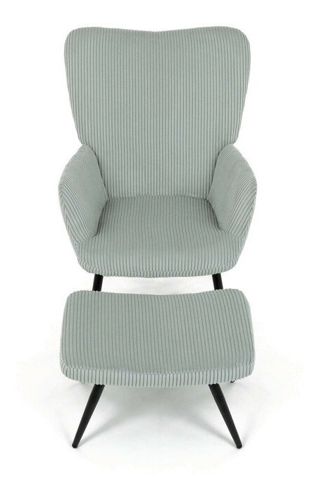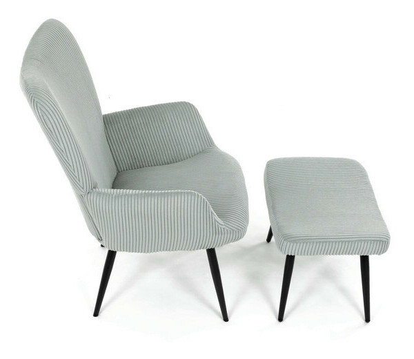 Relaxační křeslo s podnožkou v modrém manšestru nabízí pohodlné sezení díky měkkému čalounění a ergonomicky tvarovaným područkám. Pevné černé kovové nohy zajišťují stabilitu a dlouhou životnost. Manšestrová látka dodává křeslu příjemnou texturu a vizuální hloubku, která se hodí do moderních i klasických interiérů. Součástí je praktický taburet pro pohodlné opření nohou, který sdílí stejný design a materiál. Křeslo není otočné ani rozkládací, což podtrhuje jeho jednoduchost a funkčnost.