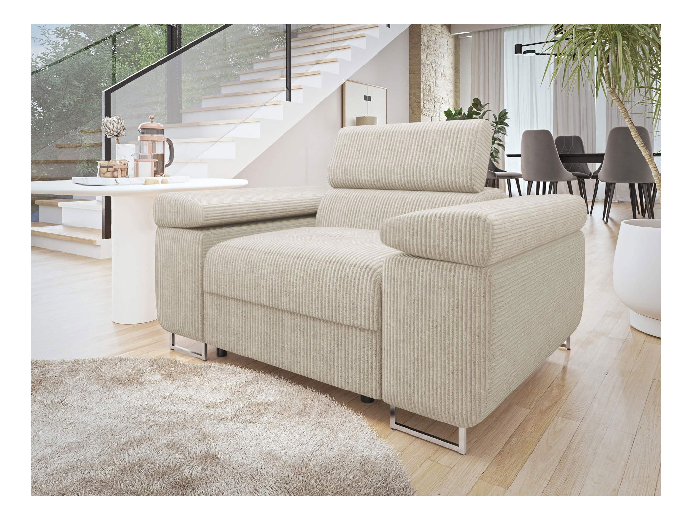Moderní křeslo Terazuro 1 S je základem pro relaxační část domu. Potah z manšestru umocňuje pocit tepla a útulnosti v okolí. Symetrické drážky navíc dokonale splynou s jakýmkoli dekorem – ocení je zejména interiéry zařízené v rustikálním, skandinávském a moderním klasickém stylu. Křeslo Terazuro 1 S lze umístit také v kanceláři, recepci či domácím čtenářském koutku. Umístěno v blízkosti police s knihami zajišťuje pohodlí a klid při relaxaci s vaší oblíbenou knihou. Při pohodlném sezení si v něm užijete také sledování filmu či nové epizody naší oblíbené série.