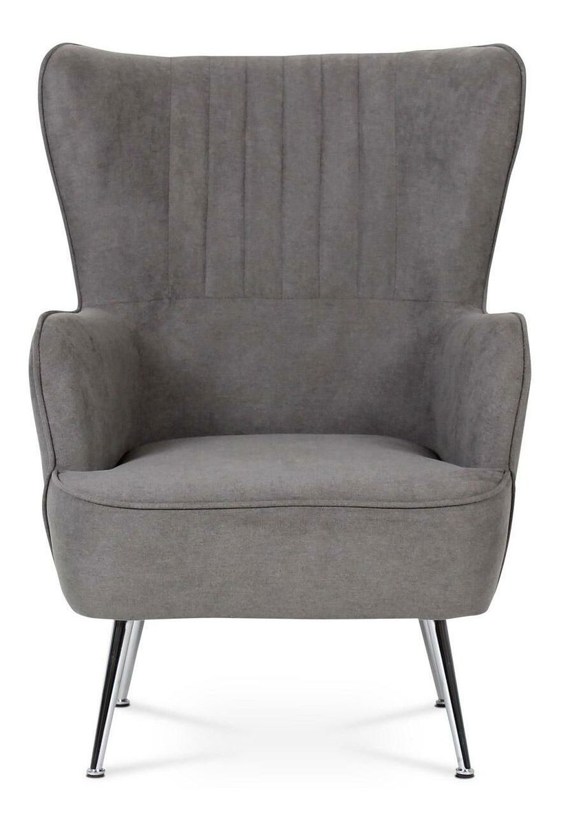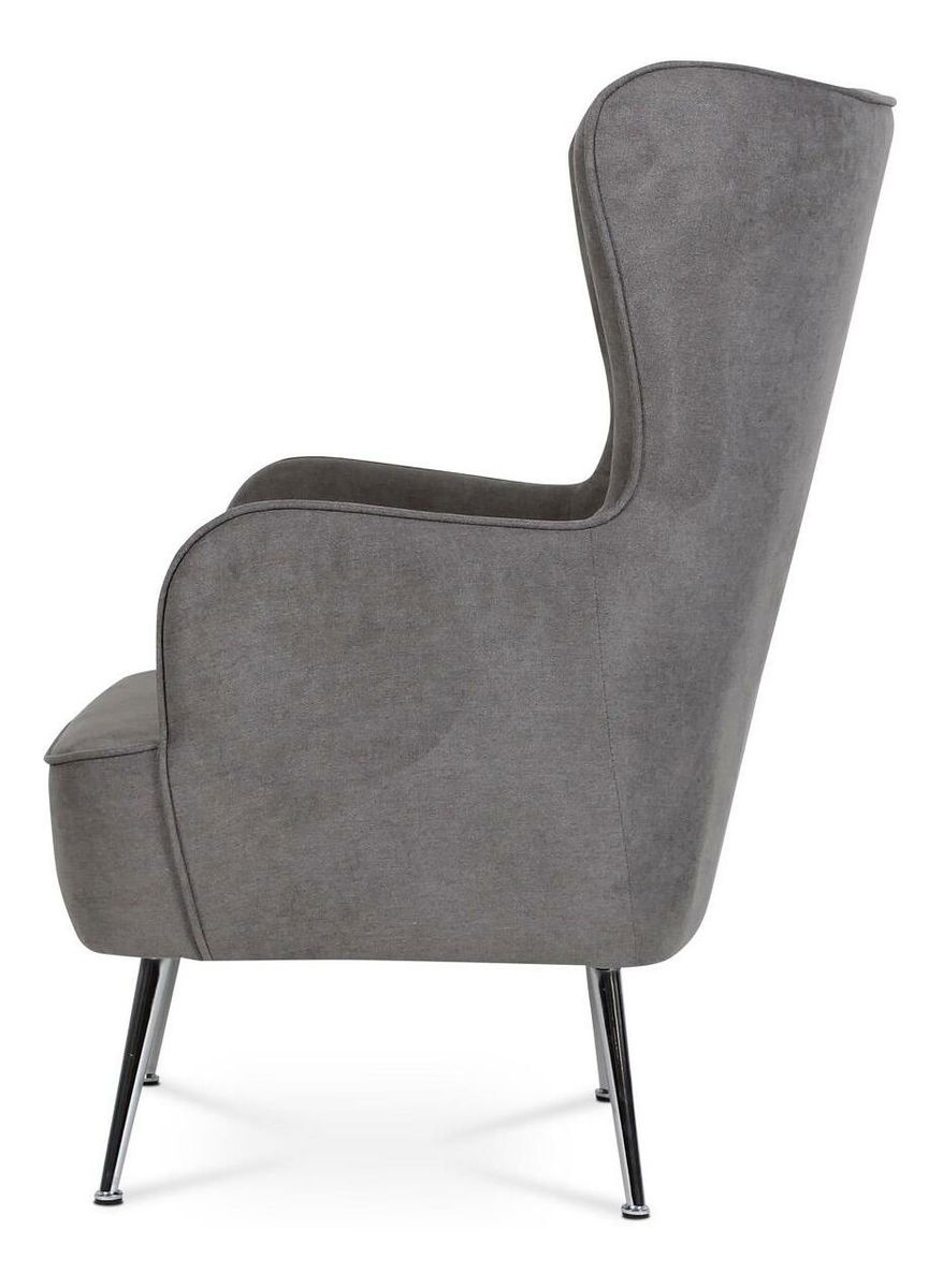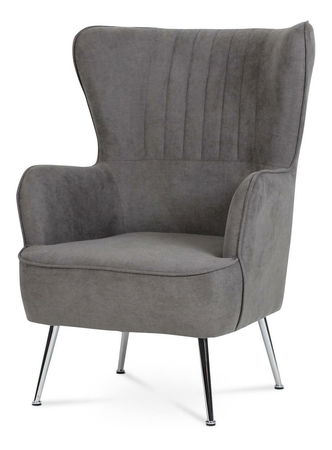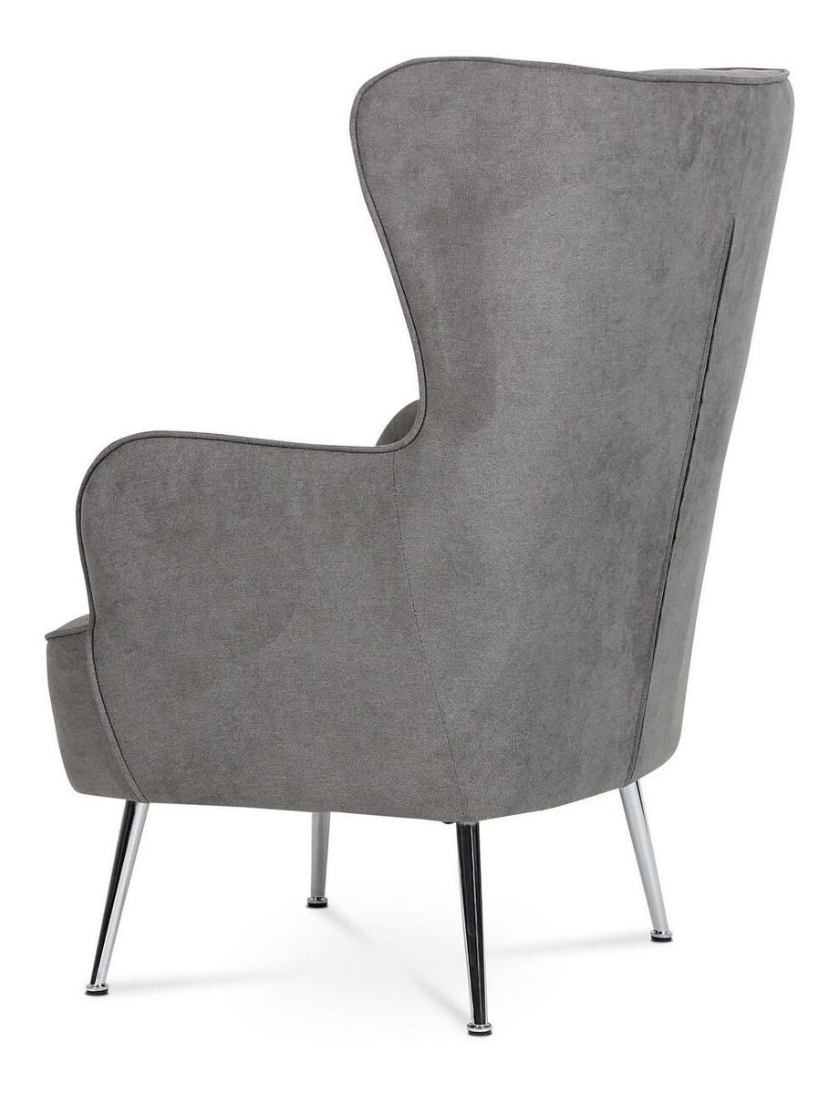ZobrazitRetro křeslo „ušák“ s vysokým pohodlným sedákem, vysokými područkami a prošívaným zaobleným opěradlem. To vše je doplněno úzkým kovovým kónickým nohama v chromovém provedení. Tím dostáváme nejen nádech lehkosti, ale také příjemný kontrast k objemnější sedací části. Stačí jen usednout a vychutnávat pohodlí, které toto křeslo přináší. Potah je z šedé látky, kostra křesla z masivu. Výplň z kvalitní PU pěny, sedák vyztužený elastickými popruhy. Světlá výška křesla je 23 cm, výška područek úctyhodných 66 cm a šířka 8 cm. Nosnost je 130 kg. Svým stylem si toto křeslo najde důstojné místo v každém interiéru, kde bude nepřehlédnutelným prvkem.