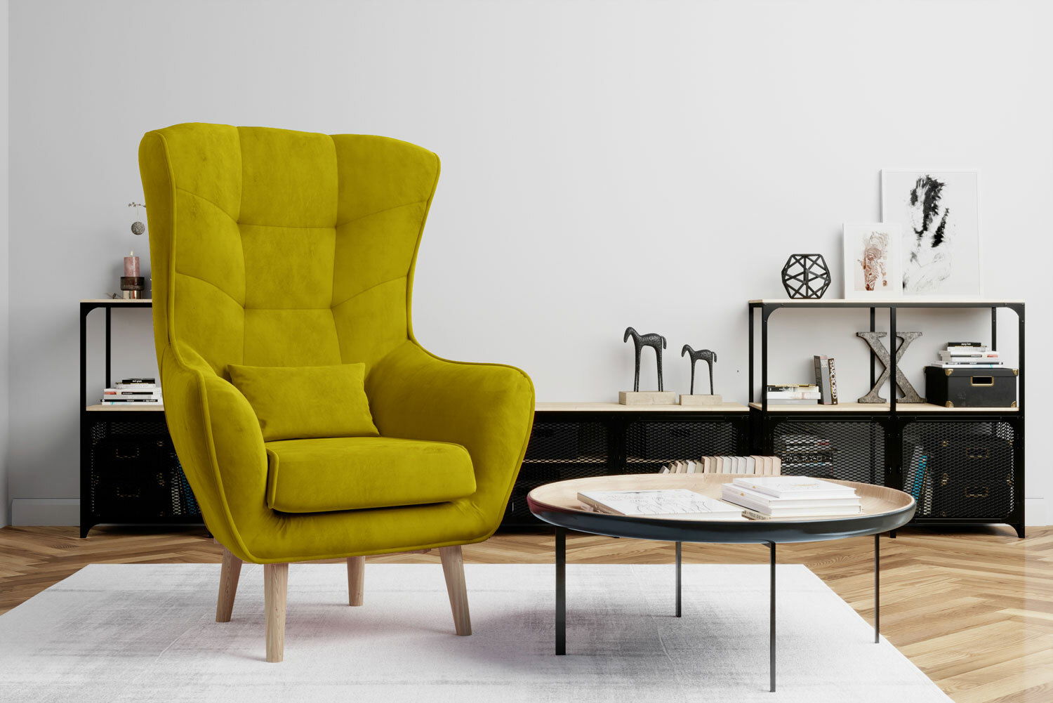 Křeslo ušák Agueda Typ 07 (žlutá) o výšce 90,5 cm a hloubce 85 cm je určeno pro relax a odpočinek. Je vyrobeno z kvalitních materiálů a stojí na vysokých dřevěných nožičkách. Čalouněno je látkou Monolit 48 a má vysoce kvalitní sedátko s pružinami HR a opěradlem z pěny T25. Rám je vyroben z HDF nábytkové desky. Výška sedáku je 47,5 cm a hloubka sedáku je 55,5 cm. Nožičky jsou také vyrobeny ze dřeva a mají výšku 21,5 cm. Křeslo má nosnost až 110 kg. Poznámka: Křeslo je částečně smontováno.