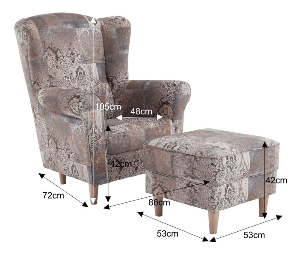 Křeslo ušák s taburetkou Aevo (vintage 1026) v hnědé barvě je vyrobeno z látky v retro vintage vzoru. Sezení má výšku 42 cm a hloubku 48 cm. Textilie má odolnost 90 000 oděrů podle testu Martindale. Rozměry křesla jsou 86x73x105 cm a jeho hmotnost je 34 kg. Křeslo unese zátěž do 120 kg, zatímco taburet až 90 kg. Křeslo se dodává v demontu. Tento produkt je ideální pro ty, kdo hledají pohodlné a stylové křeslo do svého obývacího prostoru.