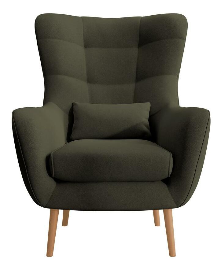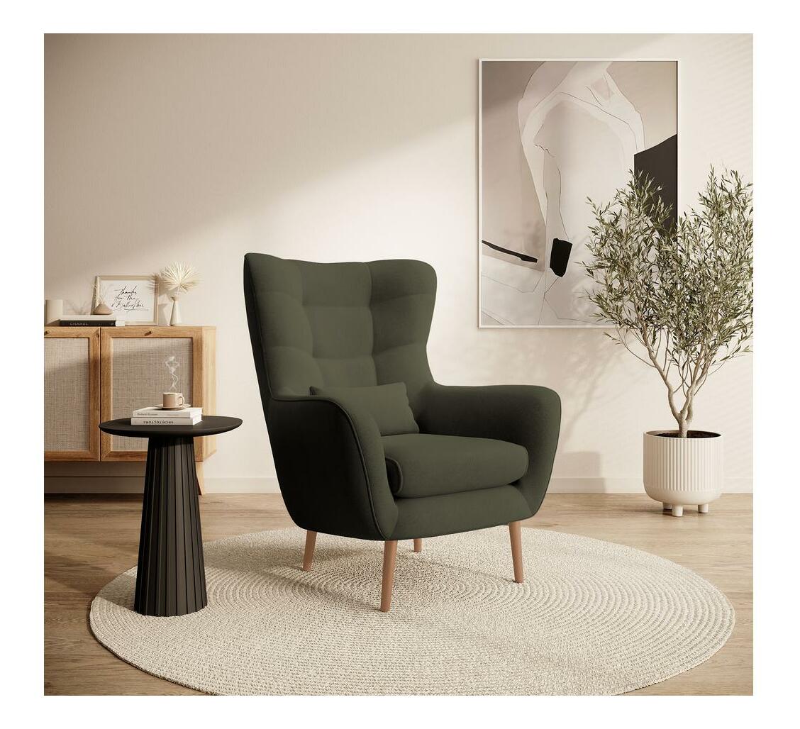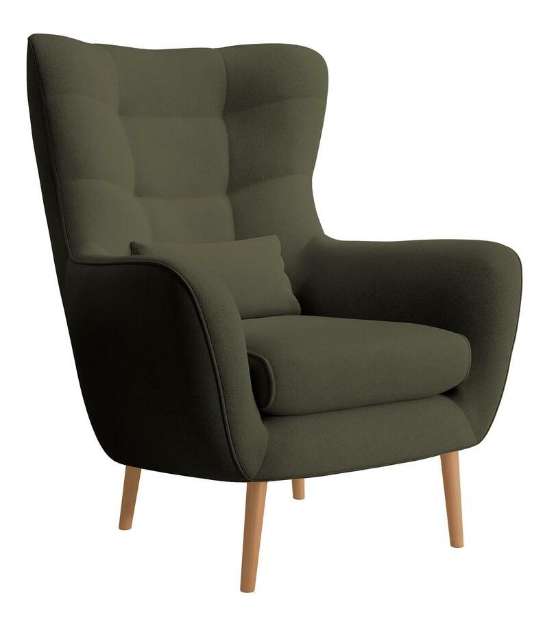 Hledáte pohodlný nábytek do obývacího pokoje, kde si odpočinete po náročném dni? Vyberte si křeslo oušek se vyznačuje vysokým opěradlem s charakteristickými ušima obklopujícími tělo a pohodlnými područkami, které vám umožní ponořit se do jeho srdce s vaší oblíbenou knihou nebo šálkem horkého čaje. Elegantní prošívání dodává celku šarm a dřevěné nohy poskytují stabilní oporu. Módní tvar a přírodní barvy zapadnou do každého aranžmá, od skandinávského až po moderní styl Detaily produktu: tloušťka pěny v opěradle: 6 cm, tloušťka pěny v sedáku: 13 cm, výška opěradla: 70 cm, pohodlné područky, stylové prošívání. na podnoži dřevěné nohy v barvě světlé dřevo, nábytek čalouněný látkou Castel 39 v olivové barvě Castel je měkká, hladká látka vyznačující se vysokou odolností proti tření, oděru a žmolkování, díky čemuž je ideální pro každodenní nábytek. Další výhodou je Easy Clean Technology – materiál se snadno čistí, což umožňuje snadné odstranění nečistot s trochou vody a měkkým hadříkem.