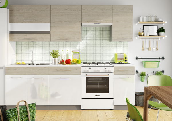 Kuchynská zostava Maira obsahuje horné aj spodné skrinky. Pracovná doska nie je súčasť dodávky. Nábytok je vyrobený z laminovaných dosiek a vysoko lesklej akrylovej dosky.