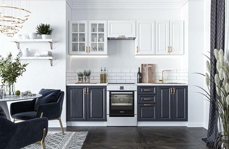 Provensálská kuchyně o délce 240 cm vytváří atmosféru venkovského šarmu se současným nádechem, díky použití MDF materiálu a detailním provedením. Pracovní deska má tloušťku 28 mm a je v čisté bílé barvě, což dodává prostoru svěžest a světlost. Kuchyně obsahuje jedenáct skříněk s frézovanými frontami, které přidávají rustikální a elegantní vzhled. Panty na otevírání skříněk zaručují tradiční používání s klasickým vzhledem, zatímco zlaté, klasické úchyty zdůrazňují luxusní prvek designu. Některé z těchto skříněk jsou vybaveny čirým sklem, které umožňuje pohled dovnitř skříněk a přidává dekorativní prvek kuchyňské sestavy. Tento styl je ideální pro ty, kteří preferují teplý, uvítací a tradičně elegantní kuchyňský interiér.