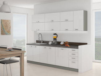 Než začnete vybírat konkrétní model, důkladně si přeměřte prostor, kde bude linka umístěna. U nás si vyberete kuchyně široké 180 cm, 240 cm, 260 cm, ale také atypické rozměry. Naznačit byste si měli také místo kde je vodovod a elektrické zásuvky. Myčka nádobí by měla být vedle dřezu a mezi dřezem a sporákem alespoň 80 centimetrová pracovní deska.