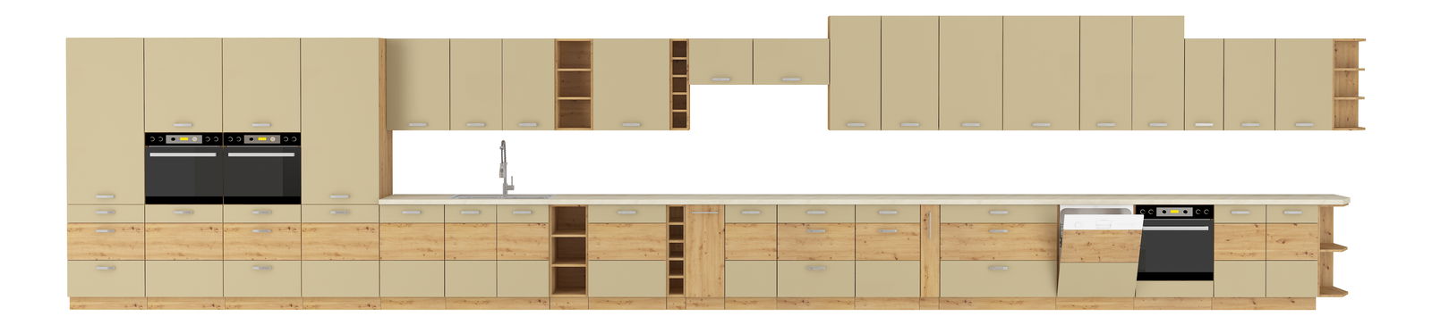 Kuchyně Arryn o rozměrech 260 cm ŠxHxV: dub artisan + cappucino je ideální volbou pro ty, kteří hledají funkční a moderní nábytek pro svou kuchyni. Tento výrobek má korpus z laminované dřevotřísky o tloušťce 16 mm a melaminovými okraji. Přední strana je vyrobena z MDF o tloušťce 16 mm a je osazena kovovými úchyty o šířce 192 mm. Okraje jsou pokryty ABS hrana o tloušťce 1 mm. Tichý zavírací systém je k dispozici na každém kromě rohových skříněk. Pracovní deska není součástí produktu, ale může být zakoupena zvlášť. Na obrázku je použita pracovní deska o tloušťce 38 mm z dub artisan. Tato kuchyně Arryn je vyrobena s důrazem na detail a kvalitu, a jistě ozvláštní každou kuchyni.