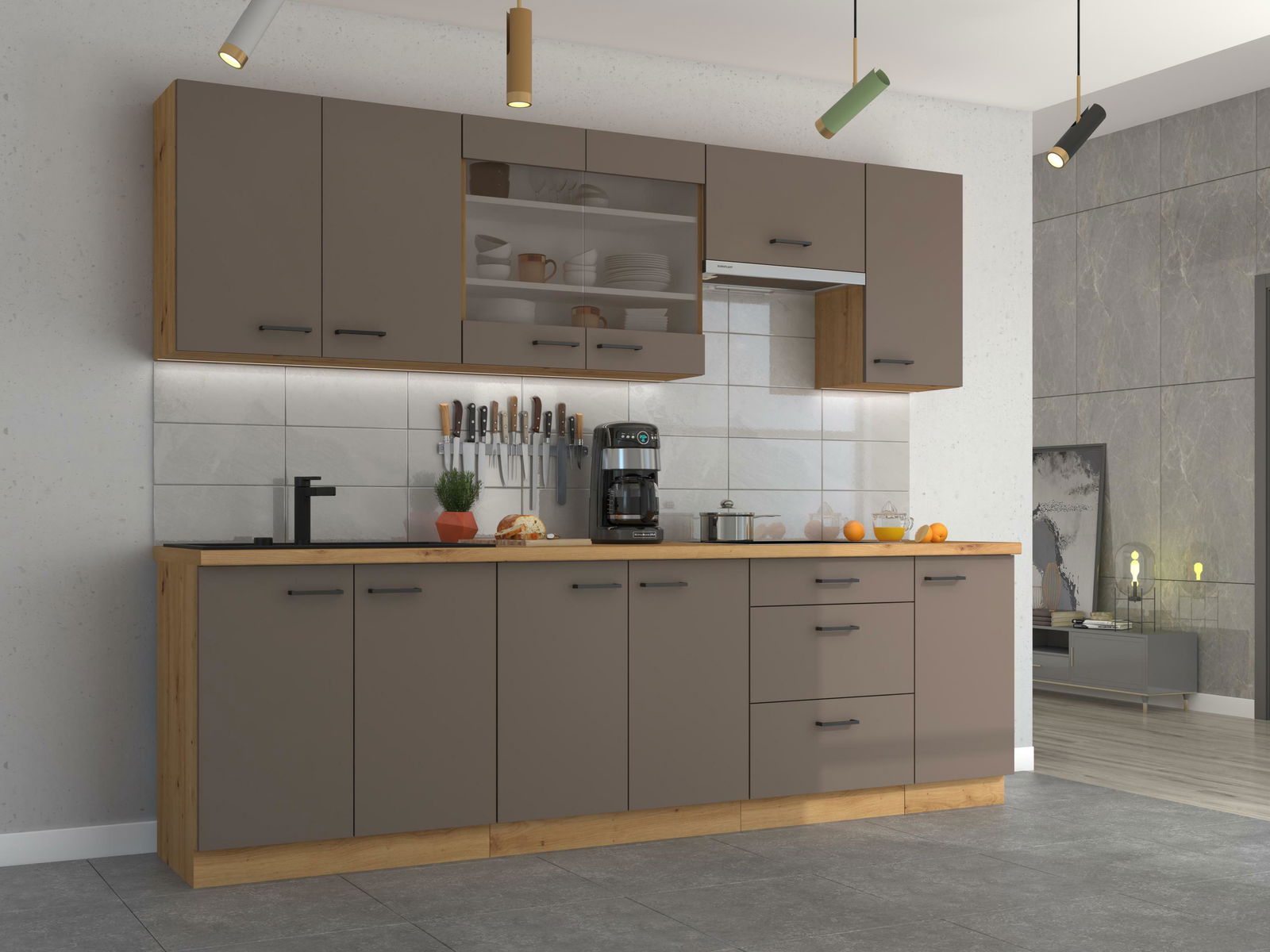 Kuchyně Barb 4 v kombinaci truflové barvy a dekoru dub artisan představuje harmonické spojení moderního designu a přírodního šarmu. Její elegantní linie a teplé odstíny vytvářejí útulnou atmosféru, která zve ke společnému vaření a trávení času s rodinou. Praktické uspořádání skříněk a zásuvek poskytuje dostatek úložného prostoru pro všechny kuchyňské potřeby, zatímco kvalitní materiály zaručují dlouhou životnost a snadnou údržbu. Kuchyně Barb 4 je ideální volbou pro ty, kteří hledají funkční a esteticky příjemný prostor pro vaření.