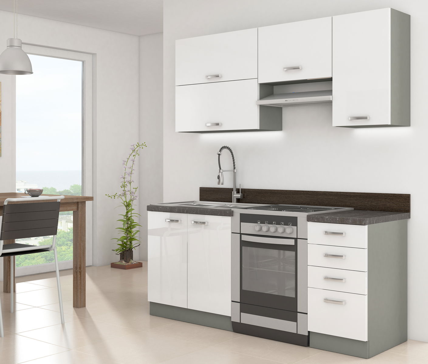 Kuchyně Brunea 180 cm ŠxHxV: šedá + lesk bílý je ideálním řešením pro vaši domácnost. Šedá + Lesk bílý korpus je vyroben z laminované dřevotřísky s melaminovými okraji a přední strana je z MDF desky o tloušťce 16 mm. Kovové úchyty jsou umístěny na vzdálenost 128 mm. ABS hrany mají tloušťku 1 mm a systém tichého zavírání je k dispozici pro všechny skříňky kromě rohových. Pracovní deska není součástí ceny, avšak na naší webové stránce naleznete nabídku pracovních desek. Vyobrazená pracovní deska má tloušťku 28 mm a barvu metalic brown. Tato kuchyně je dokonalou kombinací funkčnosti a stylu pro vaše kuchyňské potřeby.