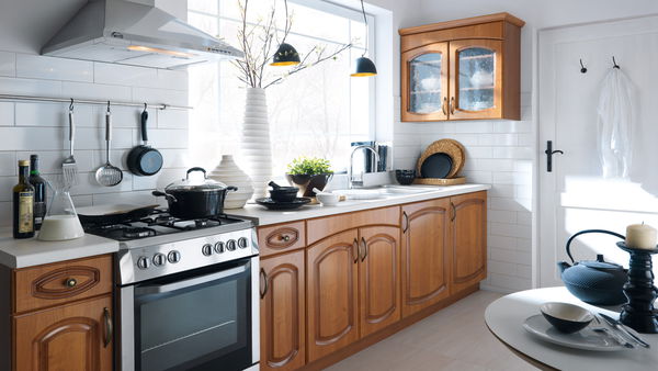 Kuchyň klasického stylu v krásné barvě patinované olše medové. Na dvířkách jsou ozdobné prvky, které zvyšují exkluzivity kuchyně.