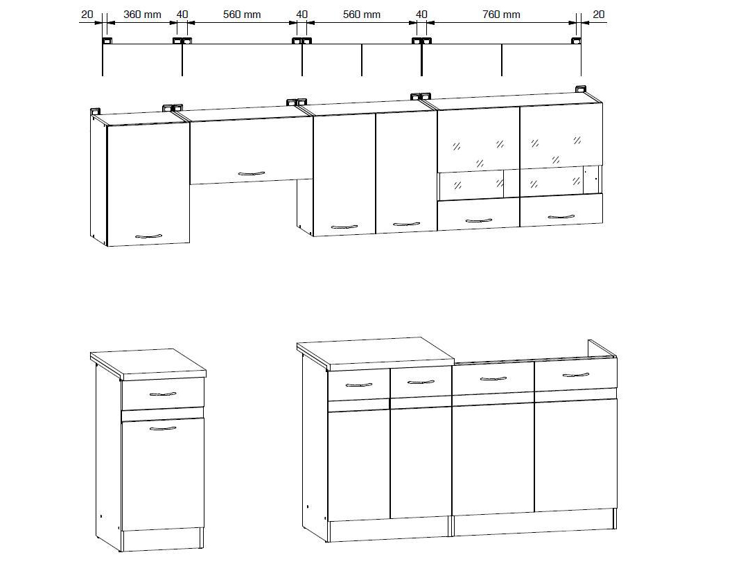 Kuchyně je dodávána s pracovními deskami na dolní skříňky s rozměry 40 cm a 60 cm. Dřezová skříňka je dodávána bez dřezu a pracovní desky.