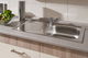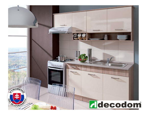 Technicky a designově špičkový model ve své kategorii. Téměř nezničitelné ABS hrany, robustní kovová úchytka a vysoce lesklé přední plochy v barvě ivory vysoký lesk. Kompaktní otevřené police a zásuvky v kontrastní barvě dub řezaný Bardolino jsou charakteristickým znakem tohoto modelu. Pracovní deska je místo, které je vystaveno největší zátěži. Umakartová úprava je tedy nejideálnějším řešením. Barevné provedení pracovní desky je barva písku.