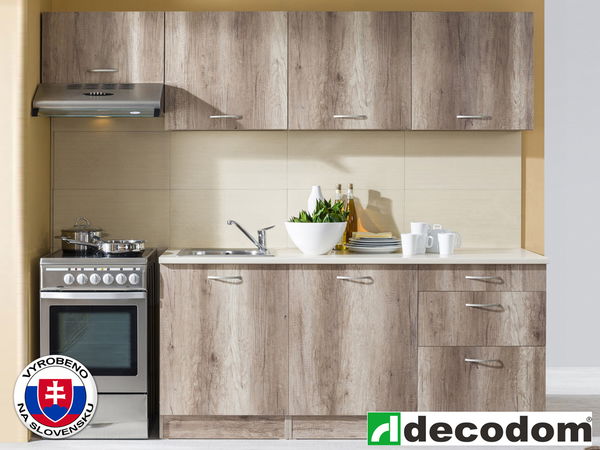 Jednoduché, tvarově čisté hladké přední plochy z laminované dřevotřískové desky v přírodní barvě dub canyon s designovou úchytkou vytvářejí vkusnou, milou a moderní kuchyň do každého prostoru. Kuchyňská sestava je přímá a vhodná do menších bytů či apartmánů. Vybavení je jen na jedné stěně a soustředěné na nejmenším možném prostoru.