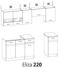 Kuchyň je vyrobena z kvalitní dřevotřísky o tloušťce 15 mm. Korpus skříněk je v provedení Dub Wenge a fronty ŠxHxV: dvířka horních skříněk jsou v provedení Rijeka světla. Spodní skříňky jsou v provedení Dub Wenge v kombinaci se světlou barvou odstínu Rijeka světla. V balení se nachází pracovní deska ŠxHxV: dle zobrazení na obrázku vyrobená v provedení Rijeka světla o tloušťce 28 mm s nalepenou odolnou ABS páskou na okrajích, která se nepoškodí i při největším zatížení. Tato ABS páska je tlustá 2 mm. Skříňky mají nastavitelné závěsy ŠxHxV: panty.