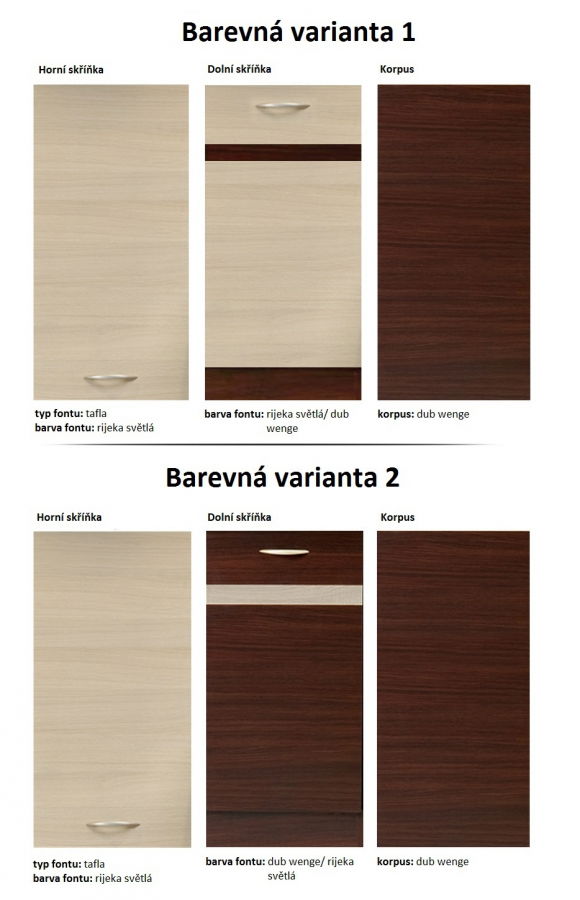 Kuchyň je vyrobena z kvalitní dřevotřísky o tloušťce 15 mm. Korpus skříněk je v provedení Dub Wenge a fronty ŠxHxV: dvířka horních skříněk jsou v provedení Rijeka světla. Spodní skříňky jsou v provedení Dub Wenge v kombinaci se světlou barvou odstínu Rijeka světla. V balení se nachází pracovní deska ŠxHxV: dle zobrazení na obrázku vyrobená v provedení Rijeka světla o tloušťce 28 mm s nalepenou odolnou ABS páskou na okrajích, která se nepoškodí i při největším zatížení. Tato ABS páska je tlustá 2 mm. Skříňky mají nastavitelné závěsy ŠxHxV: panty.