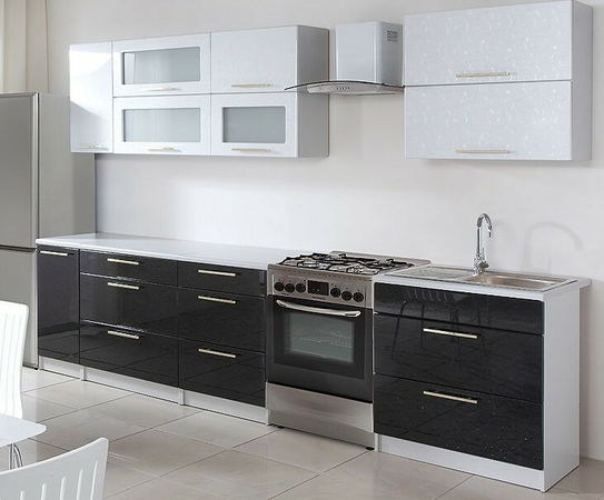 Luxusní kuchyň vhodná především do panelákových bytů. Tato kuchyně je navržena tak, že skříňky se dají poskládat v libovolném pořadí. To vám umožní si sestavit kuchyni podle svých představ. Pracovní deska je dělená podle velikosti spodních dvířek (kromě skříňky na dřez). Sokl i korpus jsou v barvě šedý popel. Spodní dvířka jsou v barvě černé v lesku, horní v bílém lesku. Lesky mají v sobě atraktivní vzor. Úchyty jsou kovové zlaté barvy. Vrchní skříňky jsou výklopné pomocí plynových pístů.