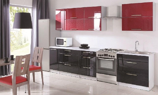 Luxusní kuchyň vhodná především do panelákových bytů. Tato kuchyně je navržena tak, že skříňky se dají poskládat v libovolném pořadí. To vám umožní si sestavit kuchyni podle svých představ. Pracovní deska je dělená podle velikosti spodních dvířek (kromě skříňky na dřez). Sokl i korpus jsou v barvě šedý popel. Spodní dvířka jsou v barvě černé v lesku, horní v červeném lesku. Lesky mají v sobě atraktivní vzor. Úchyty jsou kovové zlaté barvy. Vrchní skříňky jsou výklopné pomocí plynových pístů.