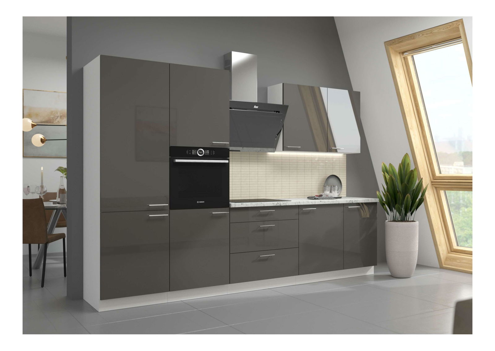 Kuchyňská sestava Lavera 18 Lesk šedý / Bílá je ideálním řešením pro ty, kteří hledají moderní a elegantní design spojený s praktičností. Kombinace lesklých šedých dvířek a bílého korpusu dodává kuchyni sofistikovaný vzhled, který se hodí do každého současného interiéru. korpus z laminované dřevotřísky. Díky systému tichého zavírání a kovovým úchytům je každodenní používání pohodlné a tiché.