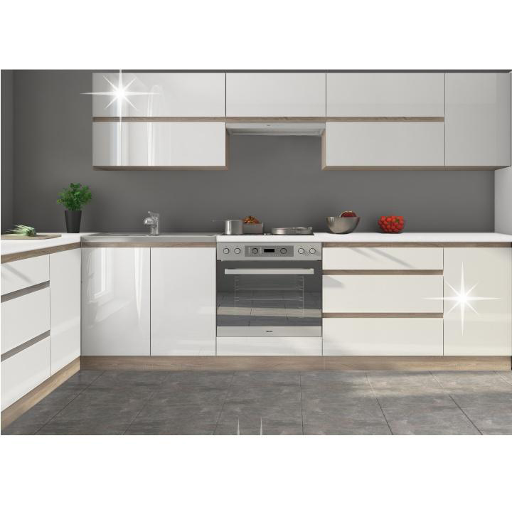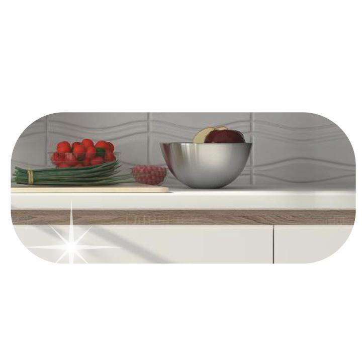 Stylová kuchyňská základní sestava Line vytvoří z vaší kuchyně moderní prostor, ve kterém bude radost vařit. Kychynská sestava je vyrobena z kvalitní laminované dřevotřísky v barevném provedení bílý vysoký lesk. Korpus sestavy je bílé barvy a lišty jsou v barevném provedení dub Sonoma. Horní rozměr s digestorovou skříňkou má je 2,6 m, rozměr dolní části 2,6 m. Pracovní deska je silná až 38 mm. Všechny dolní skříňky jsou dodávány s pracovní deskou (kromě D80ZL a D60KU) a s dolní lištou. Jednotlivé skříňky mají systém tichého uzavírání dvířek a tichého dorazu zásuvek.